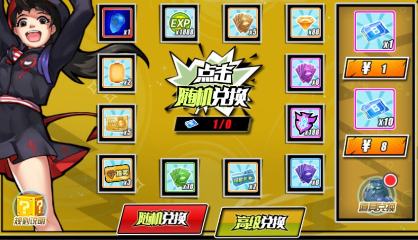 随机兑换规则:使用新品券兑换10积分赠送一次随机兑换次数,在随机兑换奖励转盘中概率兑换物品。