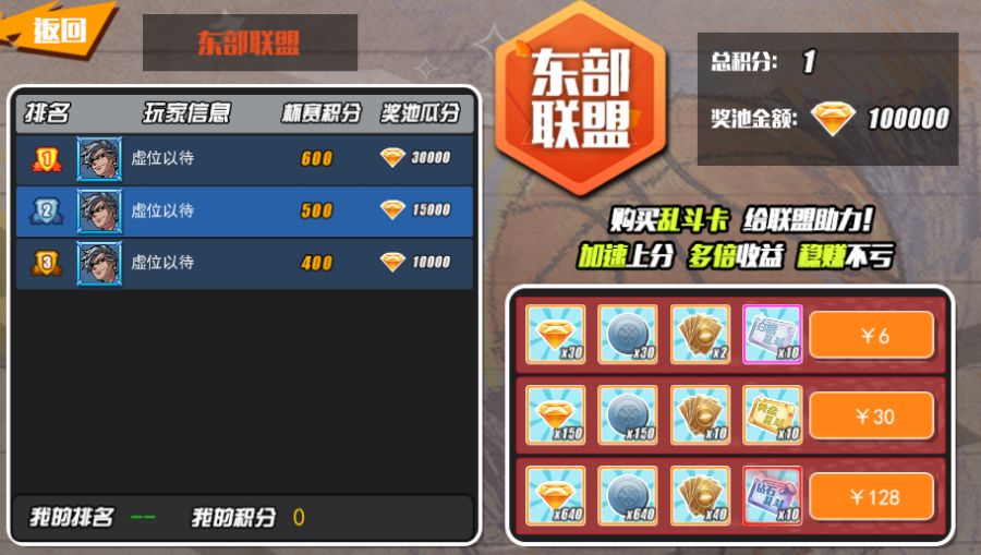 随机加入三个联盟(东部联盟、西部联盟、中部联盟),三大联盟比拼积分,积分排名越高的联盟,联盟成员获得的奖励将越丰厚(可点击联盟图标查看各联盟当前排名情况)。