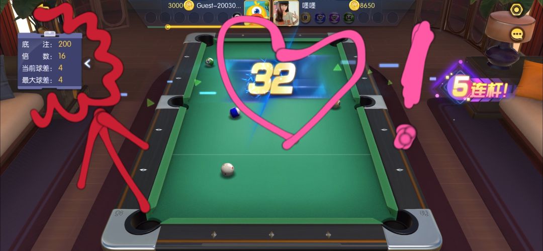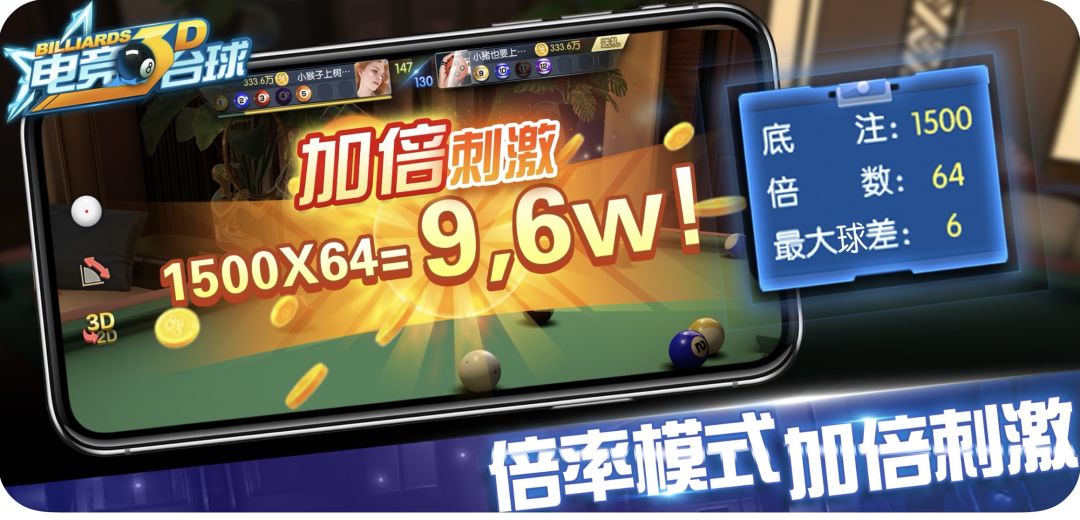之前有跟老铁们提到过,我们电竞台球有全新刺激的倍率模式玩法,根据球差底注和倍数来决定输赢金币的多少,打得好的连杆犹如斗地主里的连环炸一般,让你超级超级加倍!