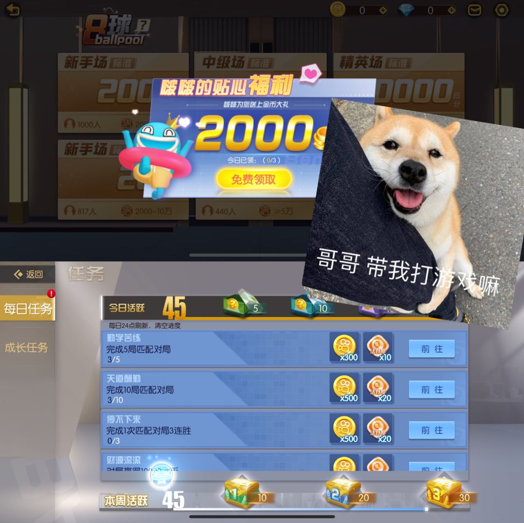 金币告急之际,还好有台球啵啵相送,还有众多活动和任务可以领取金币避免破产,啵啵哥哥真好😊