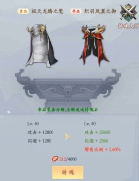 装备铸魂,装备分为七个品阶,除去帝品的装备外,其余六个品阶的装备都是可以在平时挂机打怪,锁妖塔(关卡6-12),镇魔塔(关卡8-1)等游戏玩法中随机掉落不同品阶装备,注意是随机掉落哦。帝品装备则需要道友们使用从关卡掉落,熔炼装备,镇魔塔中获取的铸魂石来自行将皇品装备升级至帝品。升级后会获得相应的装备特殊属性,需要自己斟酌选择。