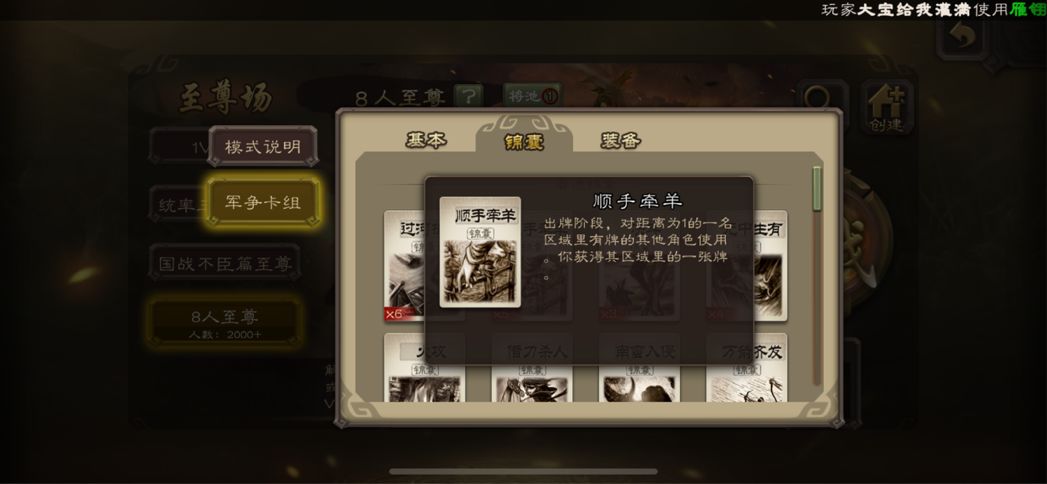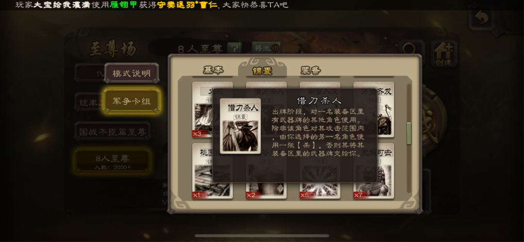 3⃣️而锦囊里有一种牌比较特殊,那就是“借刀杀人”,看下图,借刀杀人是带有“交给”字样的,所以只要获得界伊籍的武器牌就能发动【急援】而顺手牵羊却不触发。此处不是bug,而是文字描述不一样。