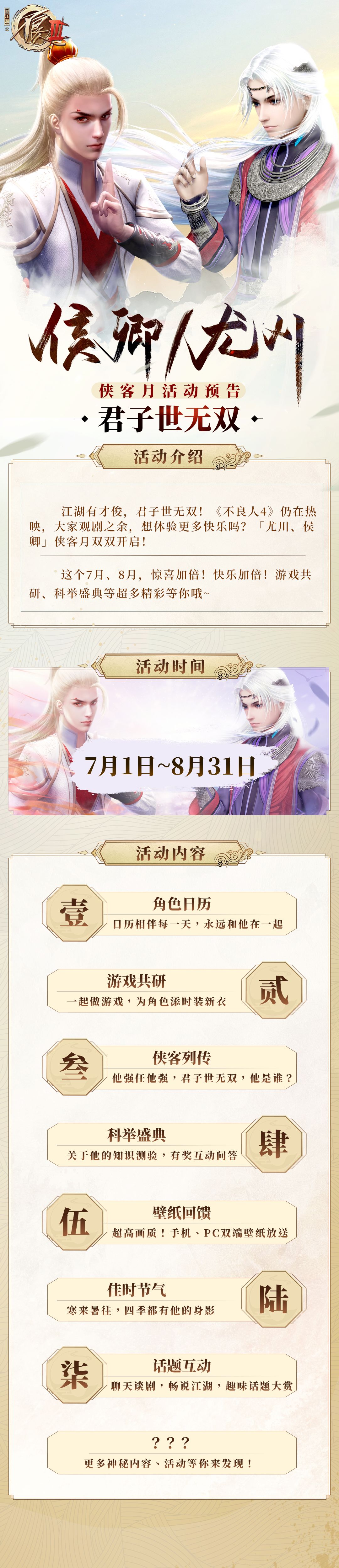 除丰富的侠客内容外,还有多样的活动等待少侠们参与,精美实物周边等你来拿!让尤川、侯卿一起陪你度过炎热的7-8月吧!
