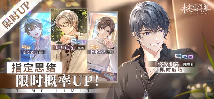 活动期间,轮替女神之影中,莫弈SSR【咫尺远近】、陆景和SSR【终夜明辉】、夏彦SR【碧蓝之间】、左然SR【秋叶寄梦】获得概率提升