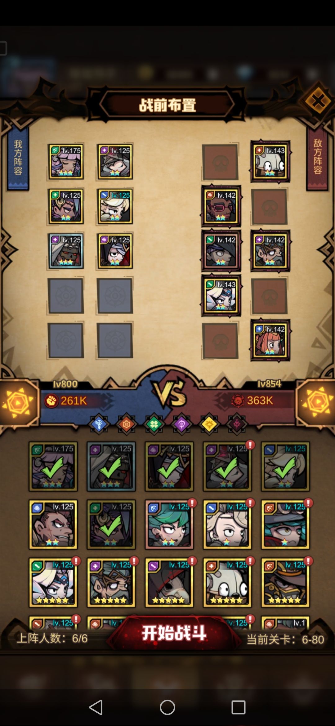 主线推图的布阵准备阶段点像象棋或者国际象棋,战斗双方主要是在5×2(5排2列)的格子中上阵6名英雄,右侧敌方是每一关预设好的,左侧是我们推图前进行布阵的范围。前期的布阵很重要,往往是决定胜负的关键,对敌方有针对性的布阵能让你跨越战力有效推图,即使战力相差100K也能顺利推图(如下图我和敌方战力差100K)。