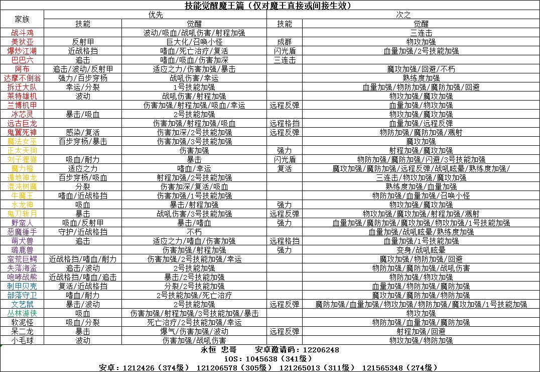 纯个人向,由于部分技能觉醒对魔王无效,因此整理了下魔王中可能会用到家族,包括直接或间接生效的技能觉醒,大概区分了下优先级,仅做参考。