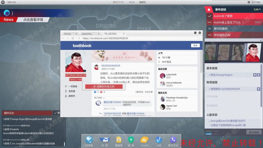 100.登录Isabelle的【Toothbook】账号。收集信息【女生过来找我麻烦】、【她的下场特别惨】、【Jim是在挣扎中弄坏了球门】、【瞒天过海 推理小说】。100.1