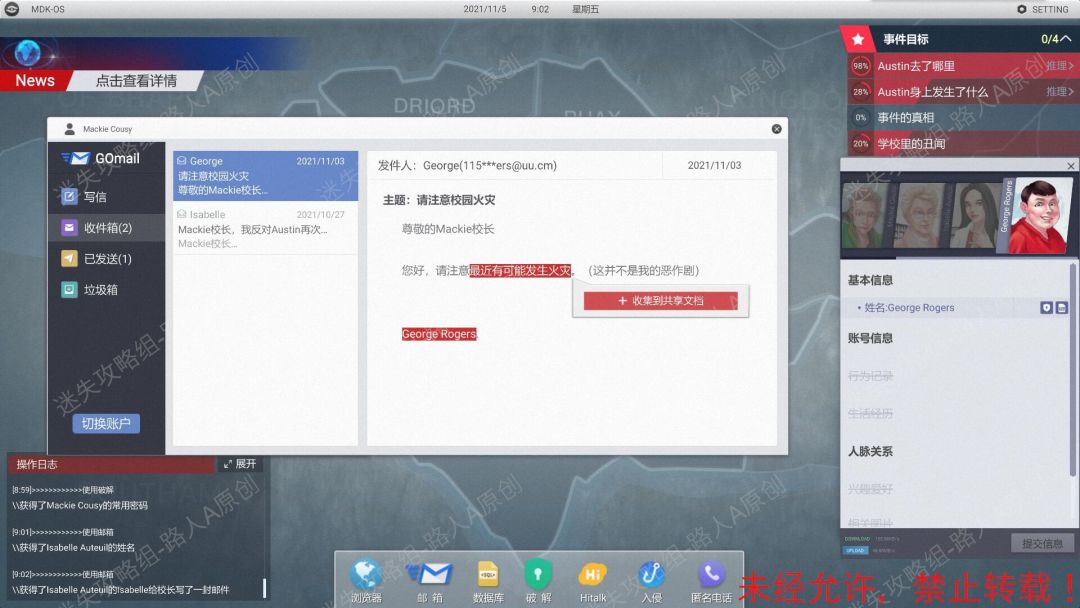 85.登录Mackie的【邮箱】。收集信息【Isabelle Auteuil】、【Jim Jones被欺凌照片】、【George Rogers】、【最近有可能发生火灾】。85.1、85.2