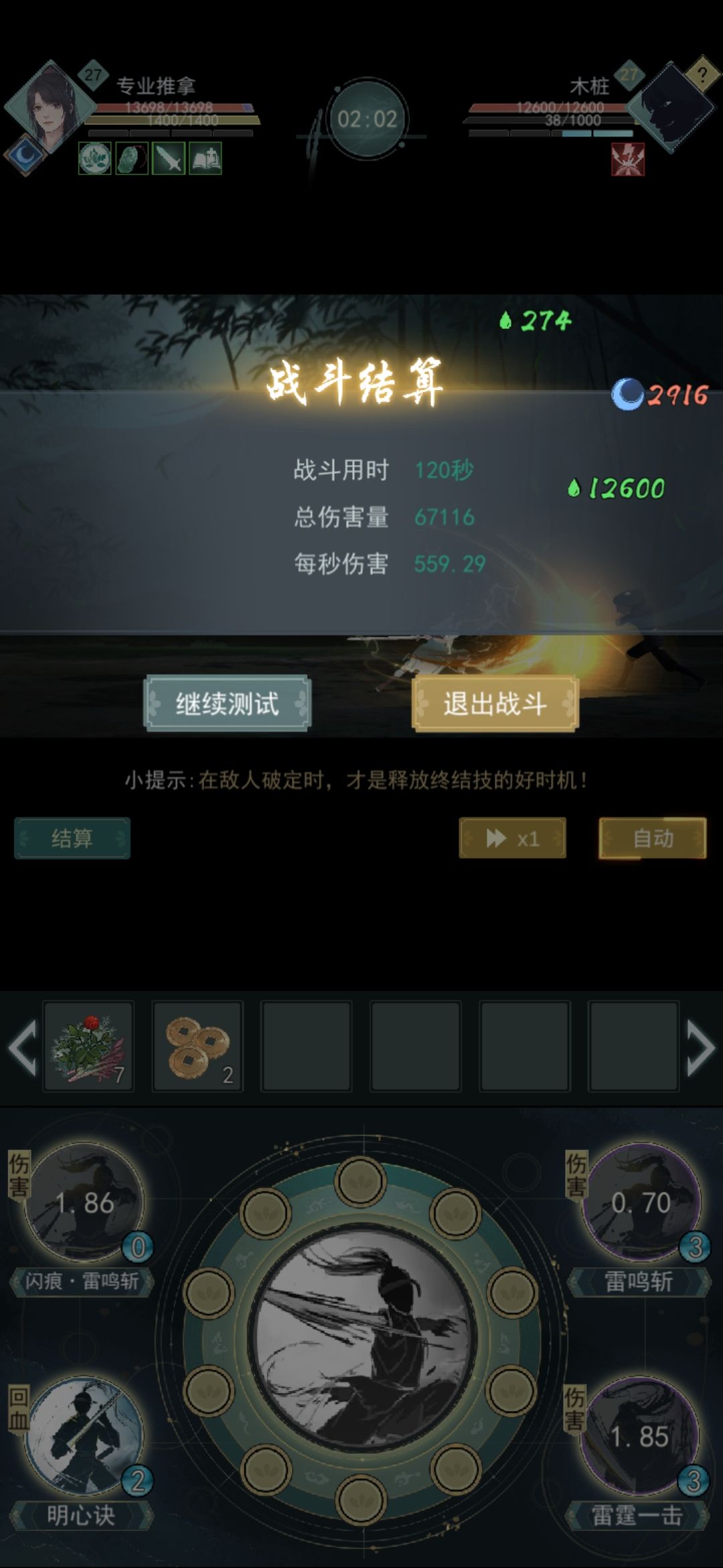 都是两分钟的伤害。从图可知 这俩中套路 从秒伤上来说。明心流是风雷流的83%的伤害。但是为何我还是推荐明心呢。因为很简单 持续时间 风雷生存能力并不算最高很难打出2分钟的伤害上限,本人也不是数据帝,我用30级的杜老头为例。风雷流大概破一次就快死了。我用明心流破了2次定力把他打死。造成这种差距的原因就是明心上,所以我们从生存能力上来对比一下 首先双方技能排序都是风雷(明心)雷霆 雷鸣,百分比回血我们按照满阶来计算。风雷一套用完恢复血量是11.5%,明心流不计算明心持续回血效果是16.5%。一套用时大概是10。双方假设都战斗2分钟 那么风雷流回血总比例是138%,明心总比例是198%。这还是单纯计算被动回血,明心主动恢复能力没计算在内的情况。差不多明心比风雷流多一半多点。所以我们可以发现如果敌人是无法快速秒我们的那种。如果强度有限的,也就是打你每回合15%的那种,明心强于风雷流。如果每回合打你30%以上的那种,则反之。