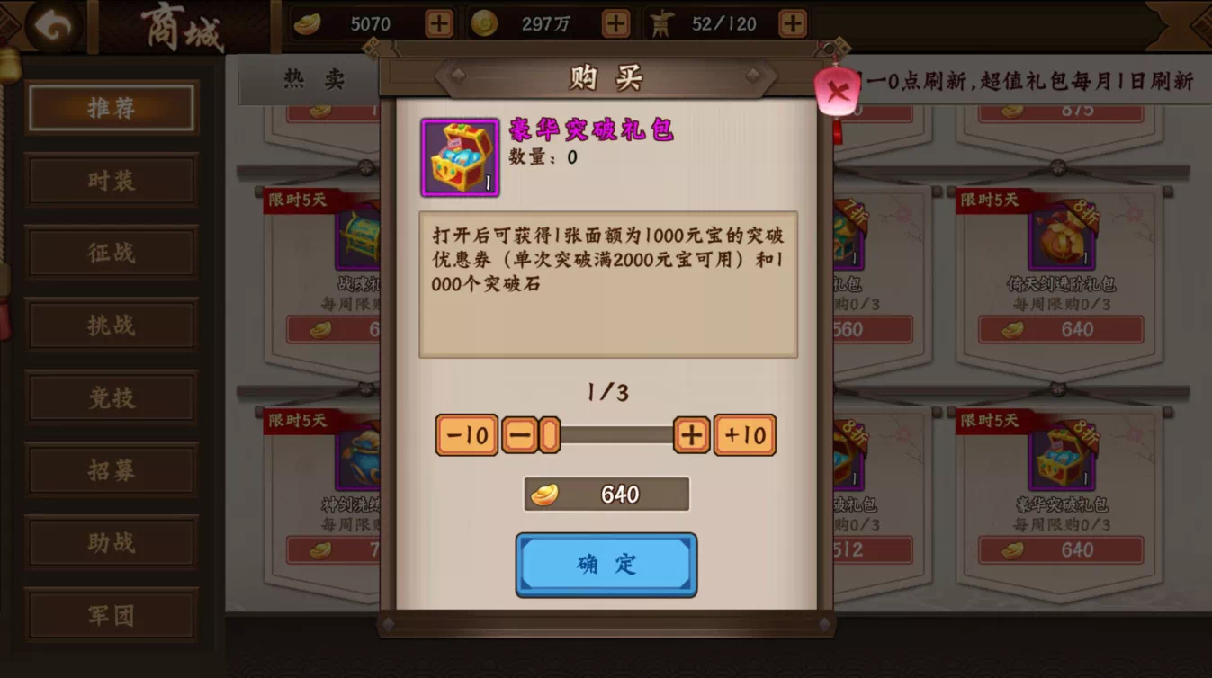 上述三种途径是一般生活平民玩家获取突破石主要的途径,当然按捺不住建功霸业之心的土豪玩家们还可以使用真金白银去折扣商店等处快速获取大量突破石用于突破!