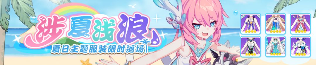夏日回忆系列服装限时再临——「涉夏浅浪」补给开启。每十回补给内必定获得【特殊服装兑换券】*2~5。