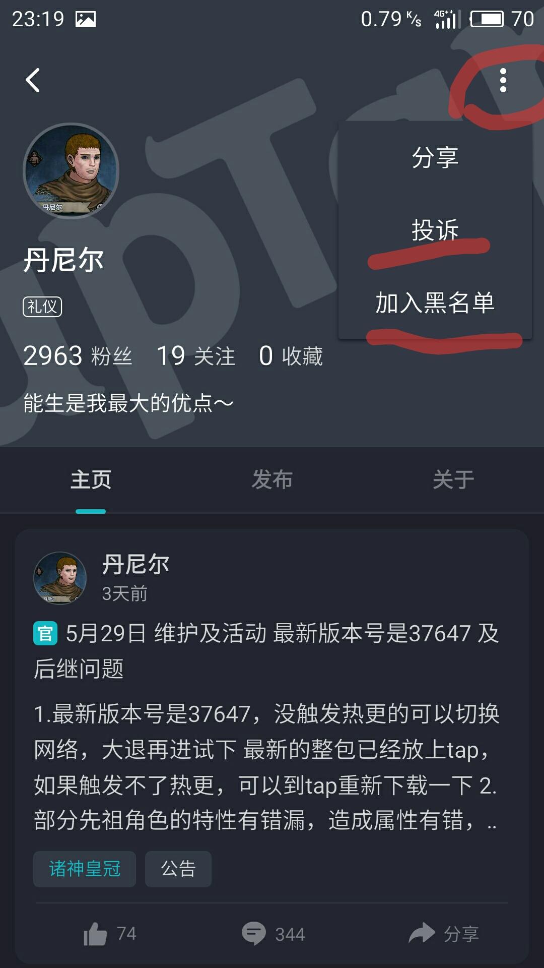 第四步,点击发帖人的头像进入其个人主页,点击右上角,点击投诉。