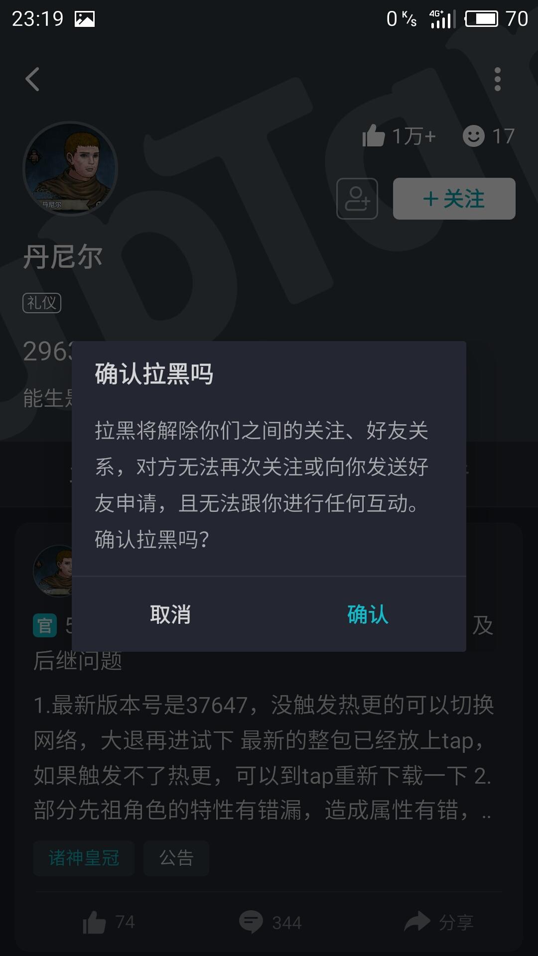 第六步,返回其个人页面,点击加入黑名单并确定。