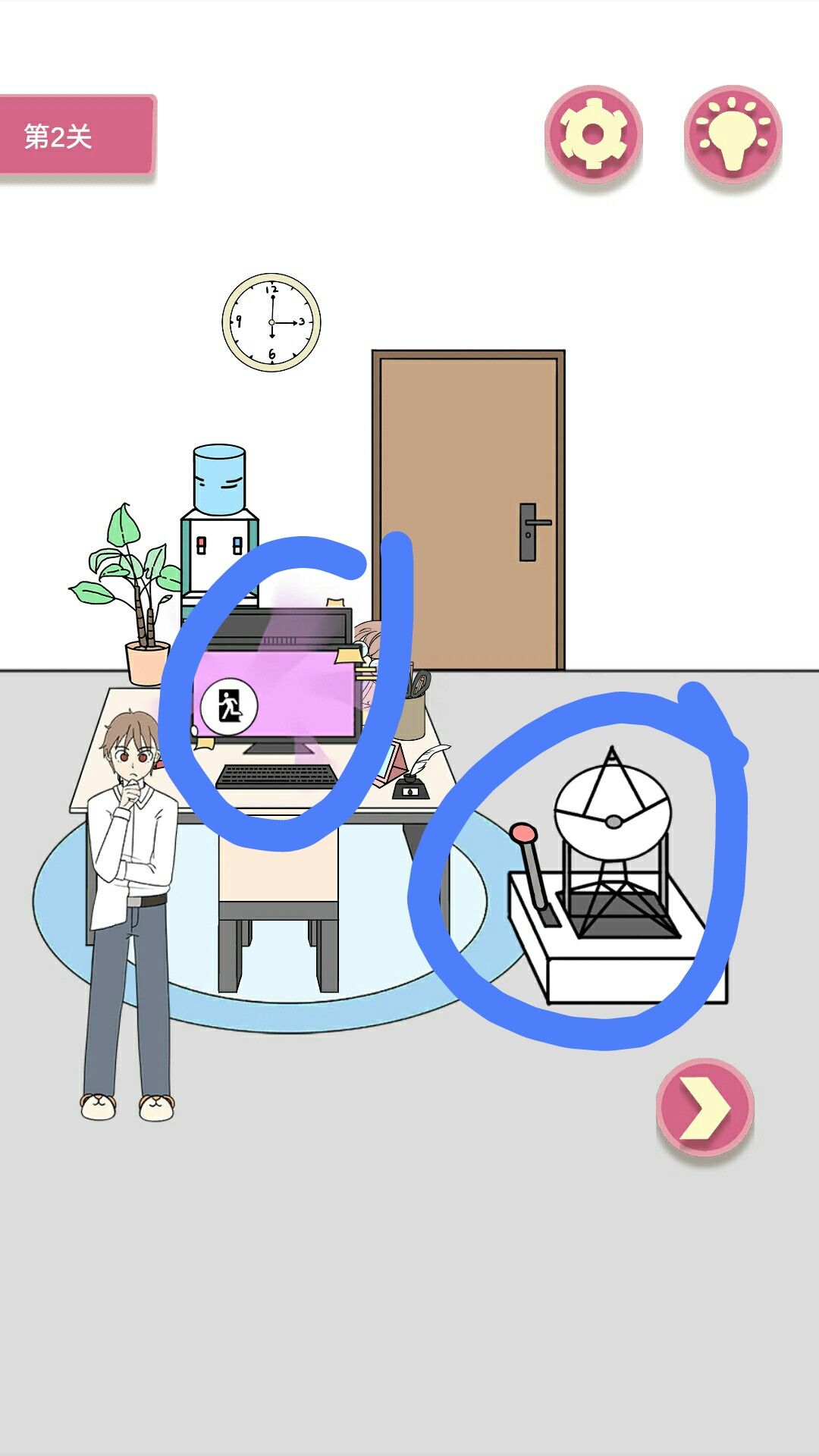 成功星:先点屏幕出现老板的大脸盘子,再点发射器,老板被吸走