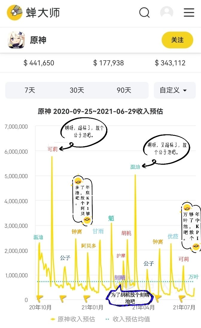 流水爆炸之后的池子必拉跨(公子真惨),年中年终压KPI放的角色人气不高(阿贝多,万叶),遇重要节日角色强度高(国庆温迪,春节魈,胡桃),新的一年刚开始角色强度也强(甘雨)。