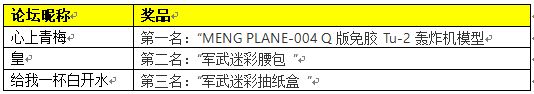 2.活动奖励:点赞数靠前的三位可以获得周边大奖!第一名:“MENG PLANE-004 Q版免胶 Tu-2轰炸机模型、第二名:“军武迷彩腰包 ”、第三名:“军武迷彩抽纸盒 ”。为了给大家更高的参与感,我们将随机在符合要求的指挥官里抽出5名幸运玩家,送出“军武迷彩零钱包”一份!奖励这么丰厚,快快参加吧~