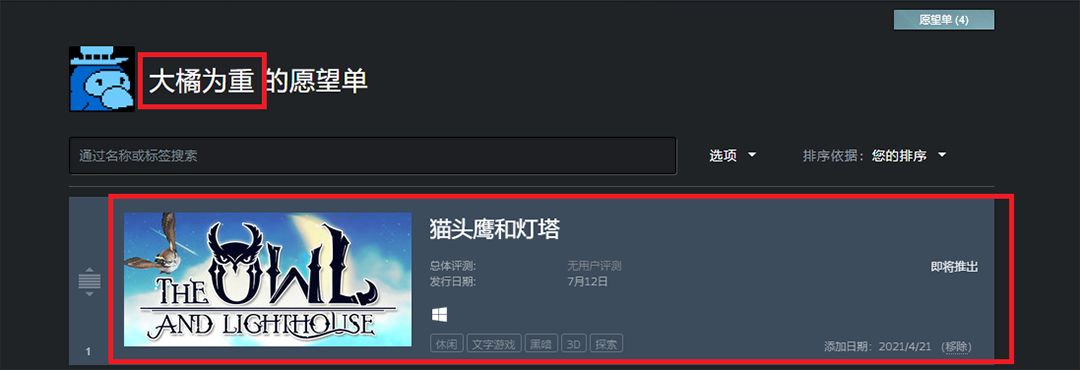 前往steam商店页面,将《猫头鹰和灯塔》添加至愿望单,随后前往商店-愿望单,截图并回帖即可参与。(截图上需要有Steam ID和游戏信息,不符合条件的小伙伴视为参与无效)