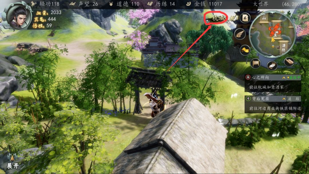 接下来,前往我们出村以后的第一站,临近潇隐村的杭城~(世界地图可自由探索,但是部分区域会遇到主动敌人,容易造成战斗失败)。