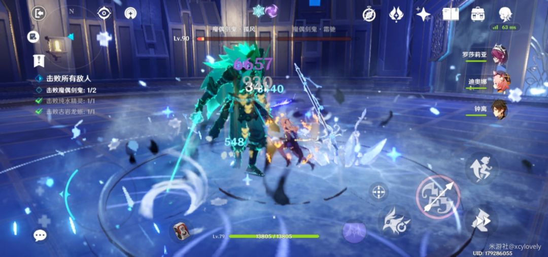 走过中间迪奥娜放Q ,走回来充好能,钟离E后点开始,罗莎莉亚QE,皇女Q/E,迪奥娜E,钟离QE,一轮下来之后便没有固定连招,在保证有盾的情况下哪里亮了点哪里,盾破了就无脑按闪避键,注意回血的时候站迪奥娜Q里别冲出去
