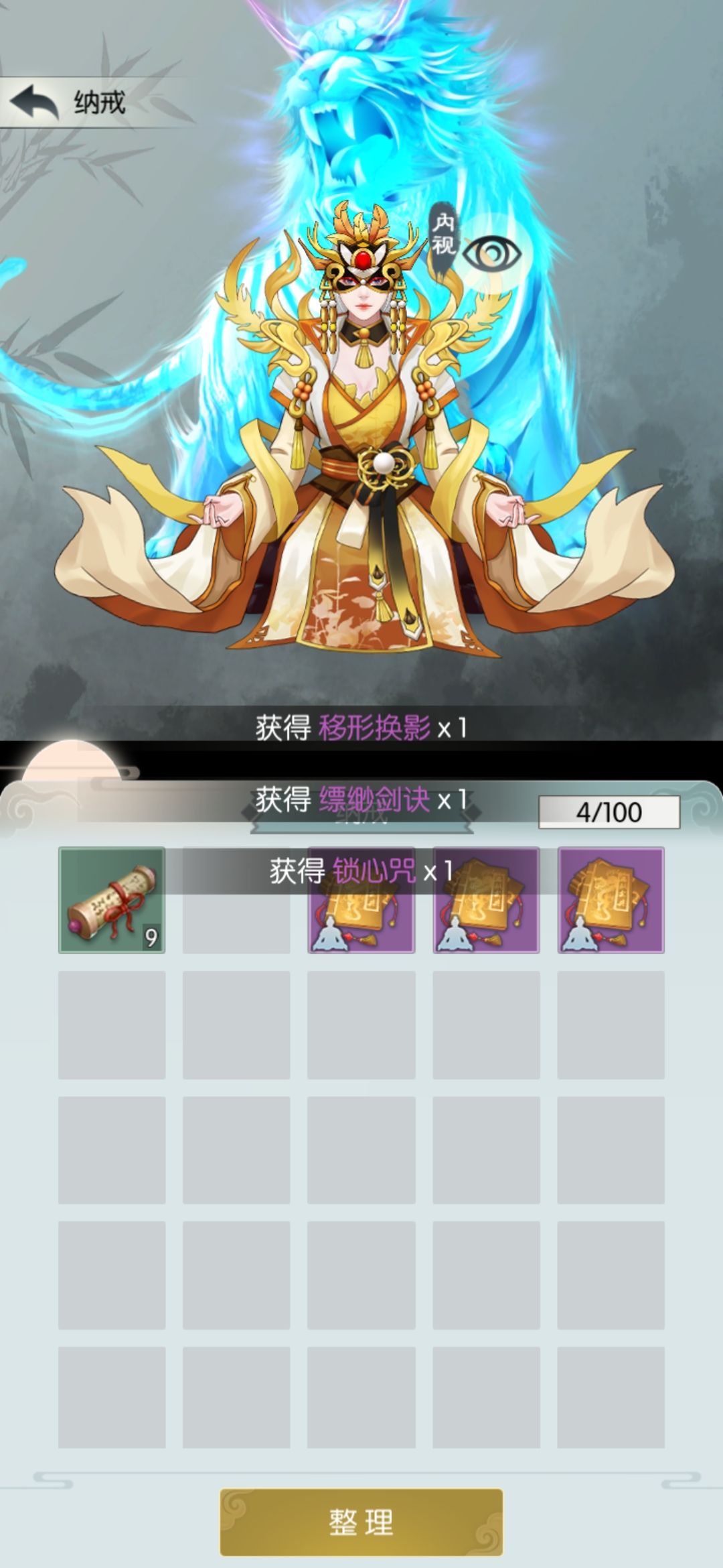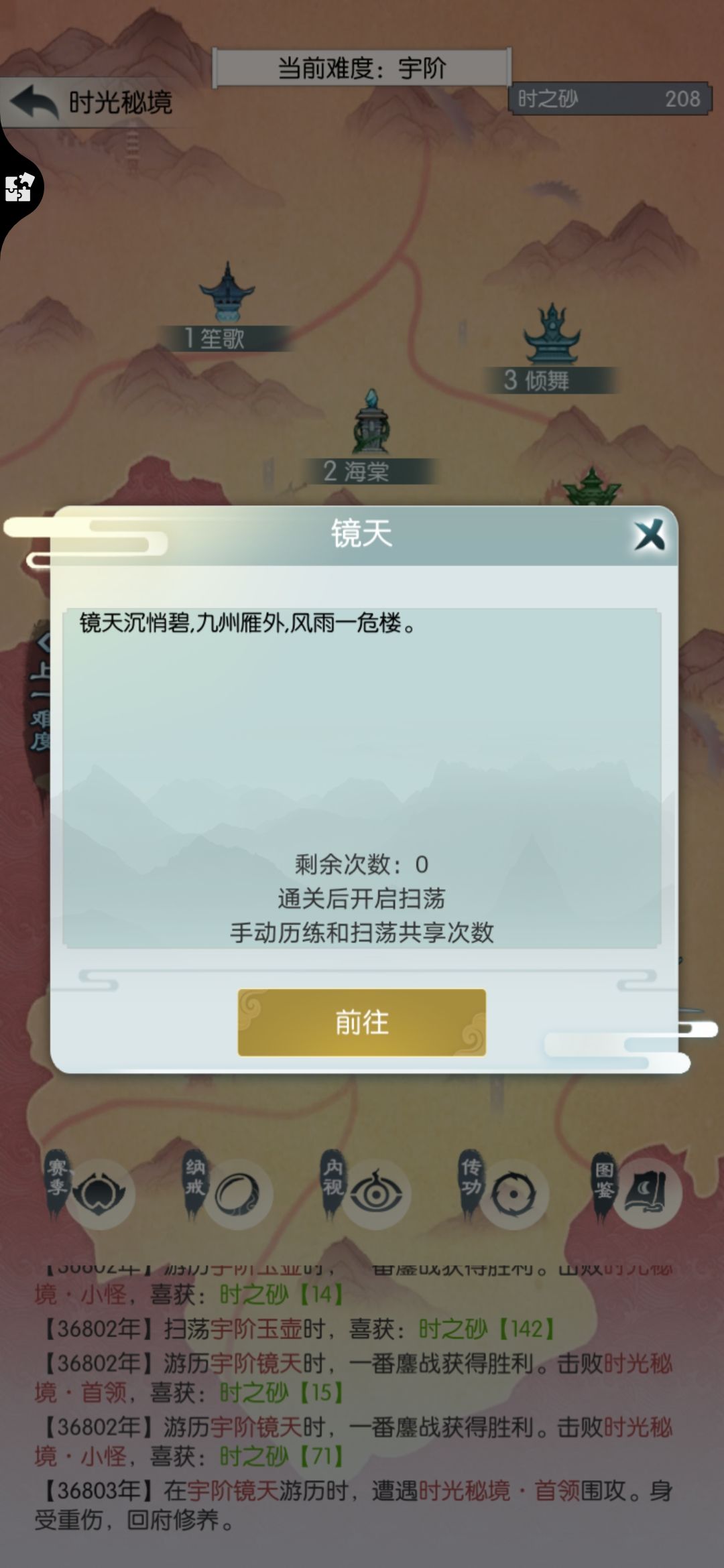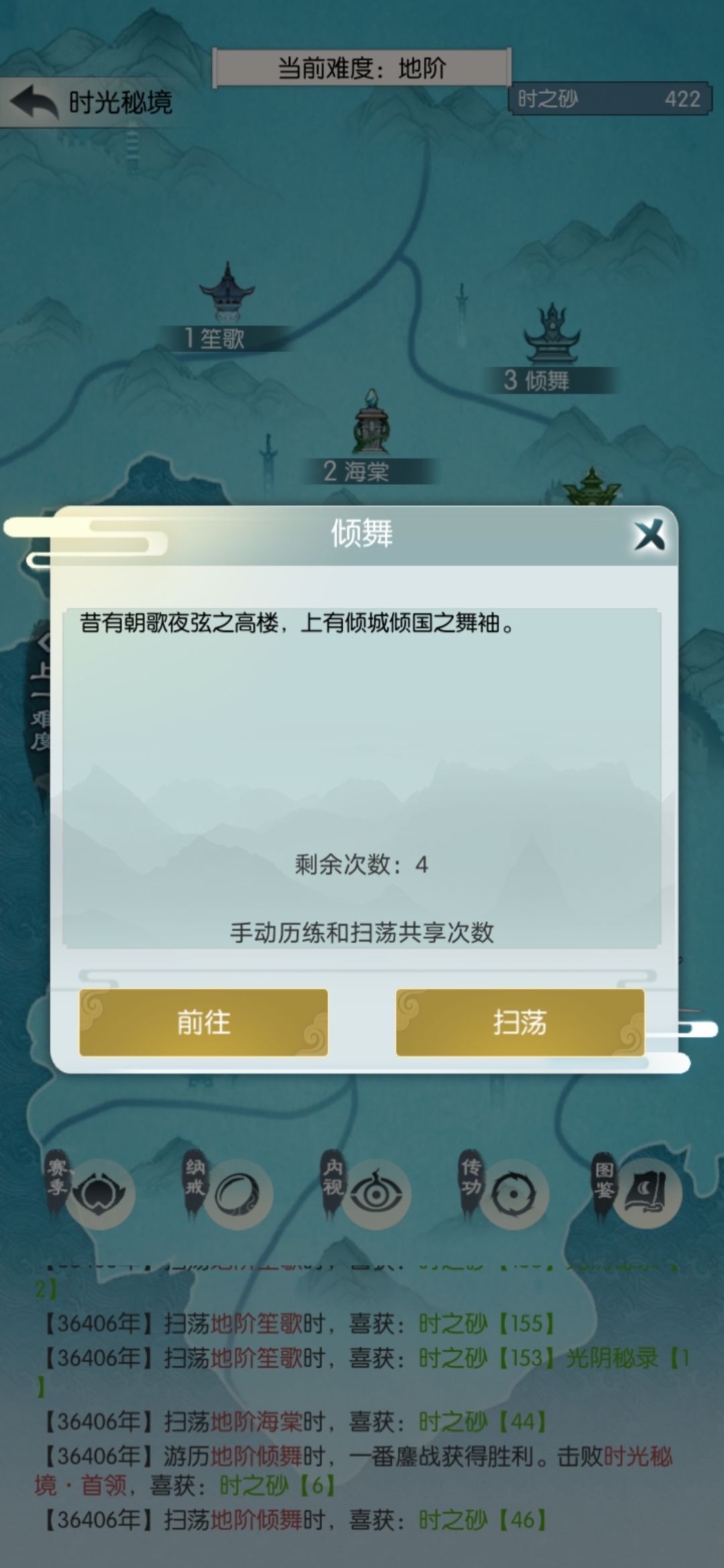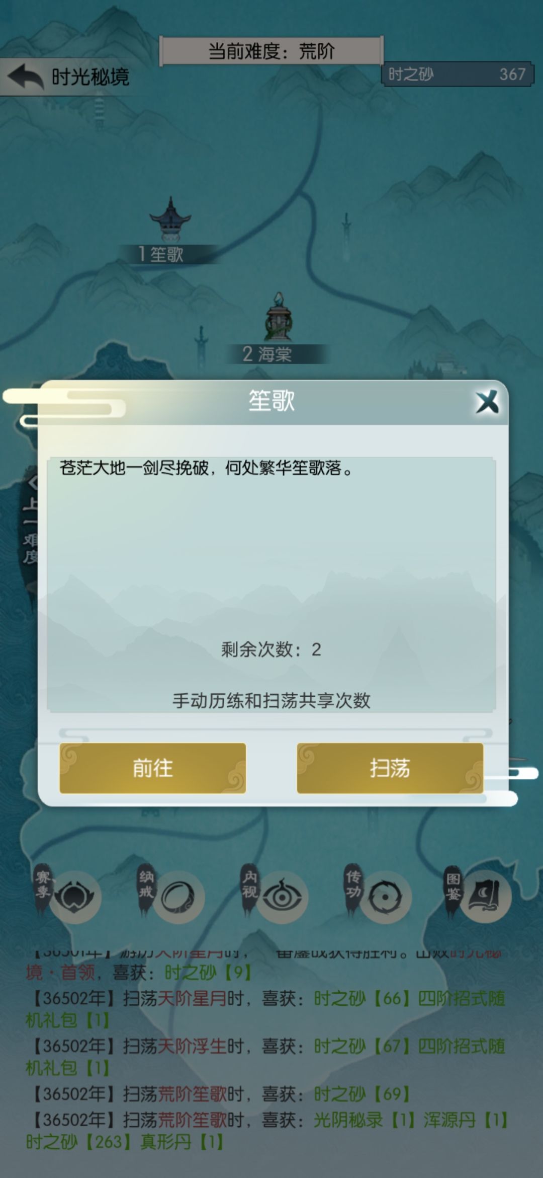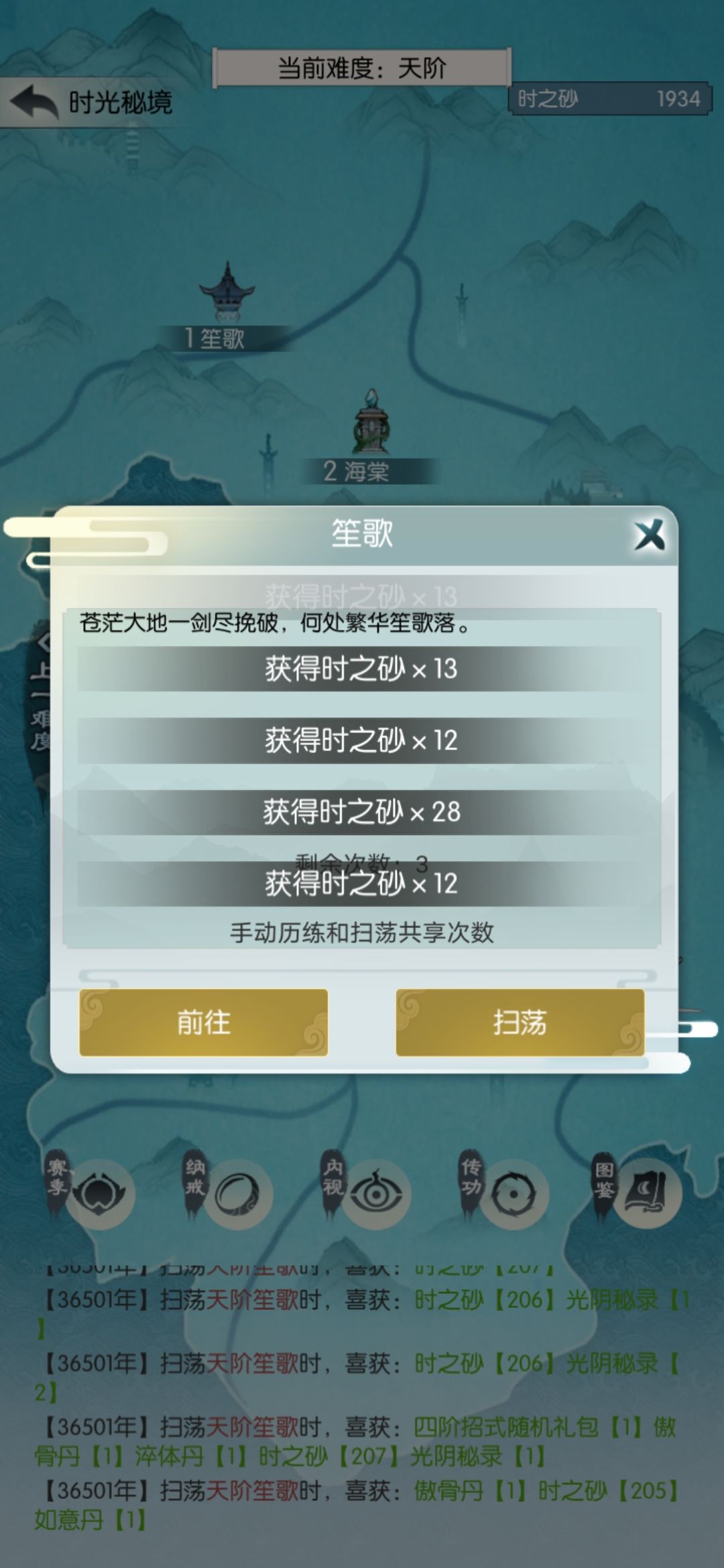 直接扫荡天笙歌够1750买天书,我扫了七次。扫荡得的四阶箱子开了个逍遥剑诀,换上。