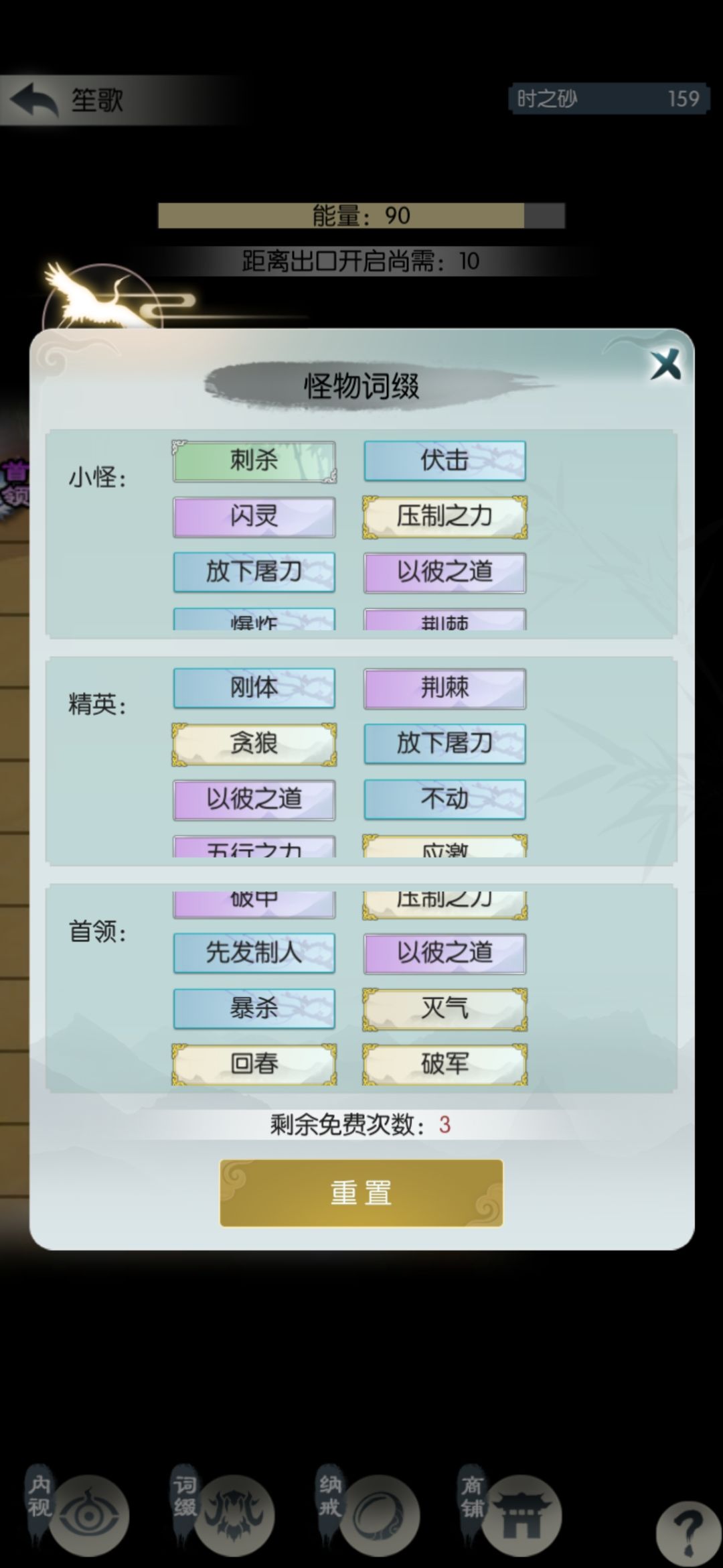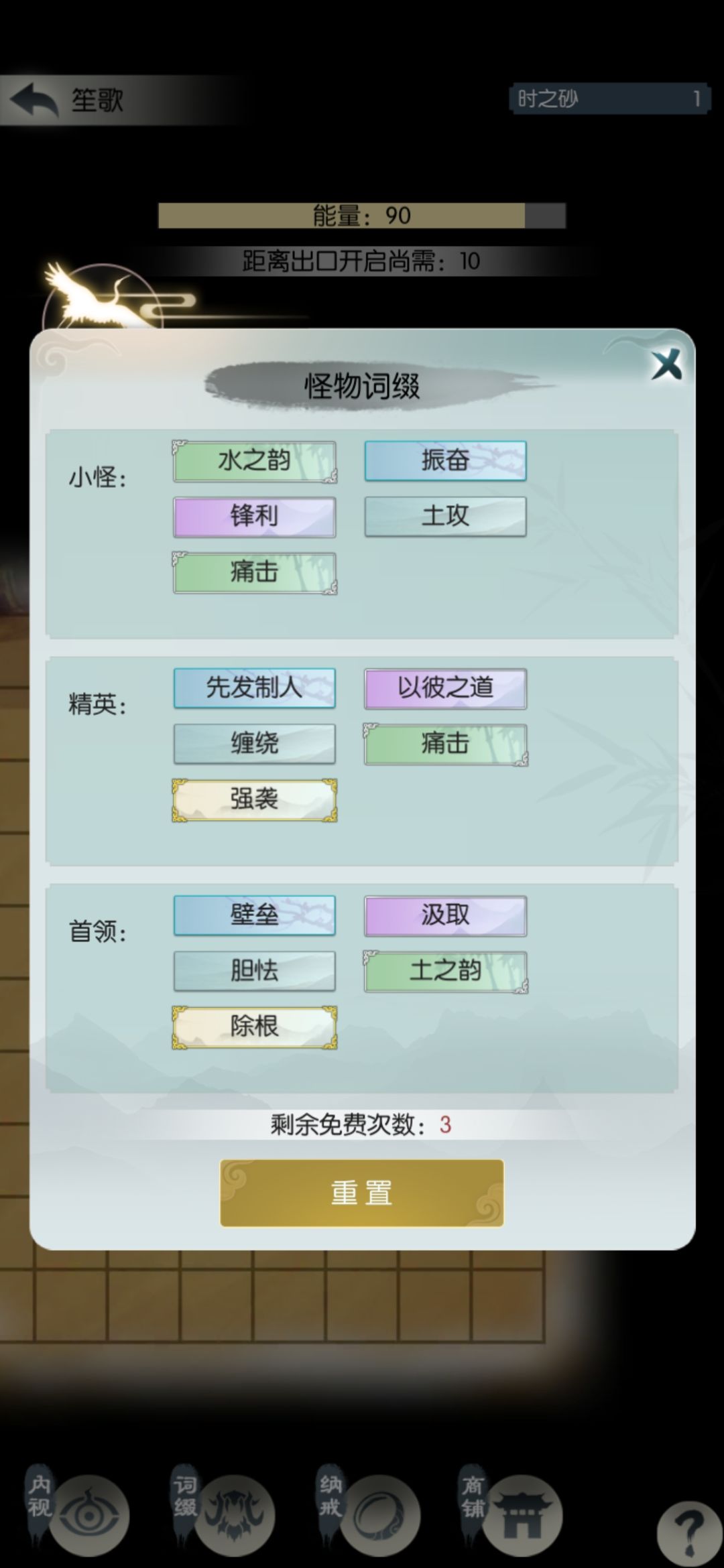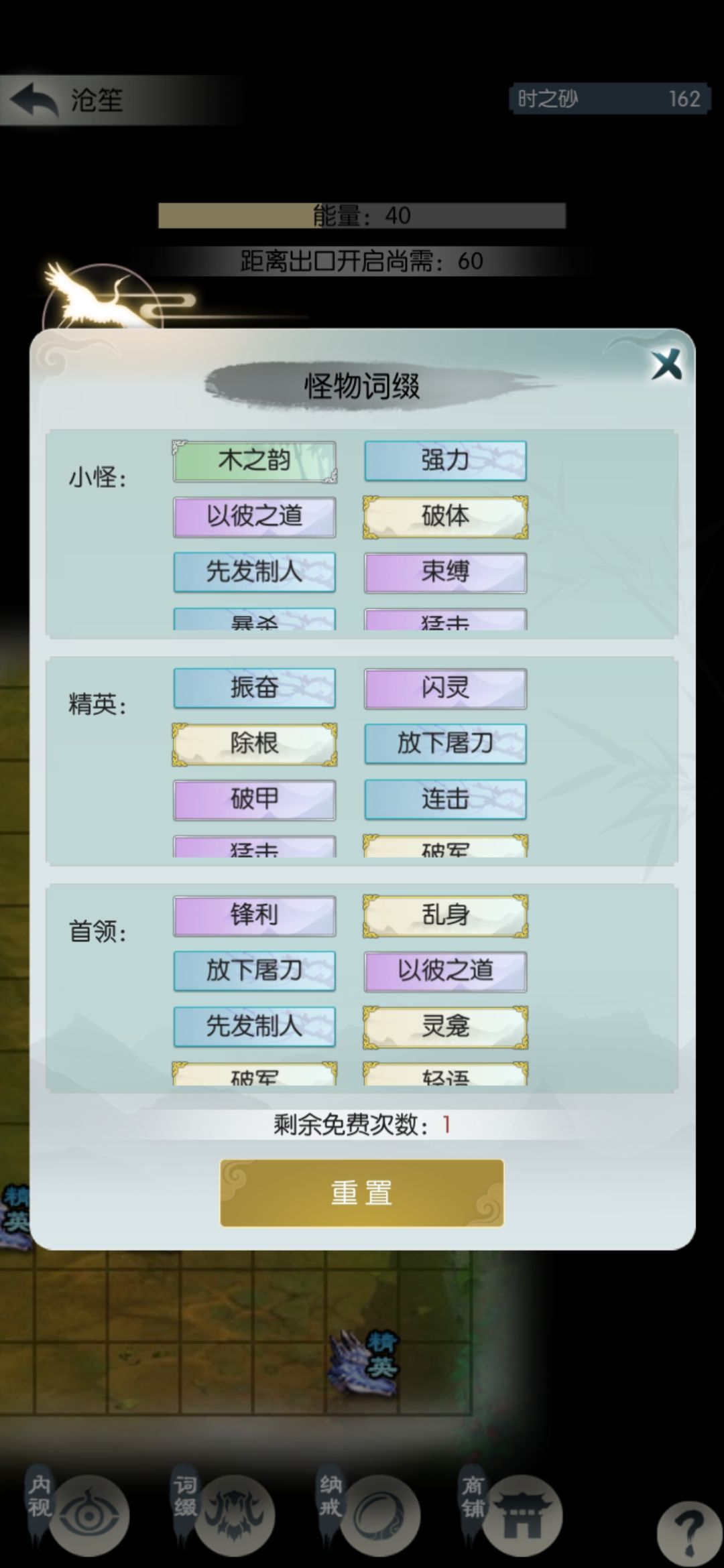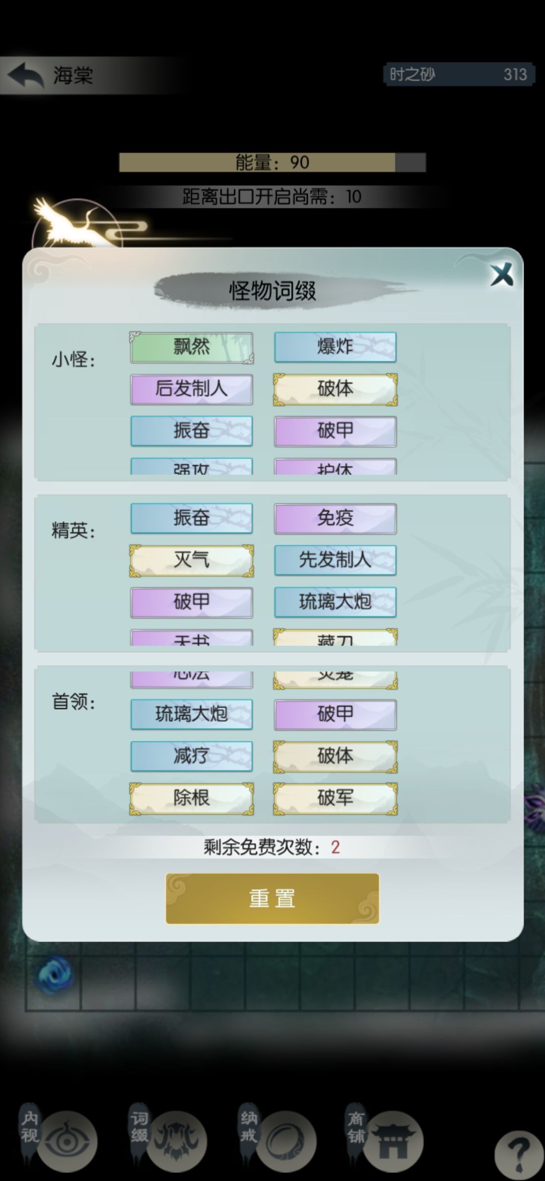 接近通关了,扫荡六次继续挑战源桑落。到源沧笙翻车,观察了一下词缀,精英和首领很不稳,有破军振奋除根先发等等,打了小怪就使用最后一次重置。