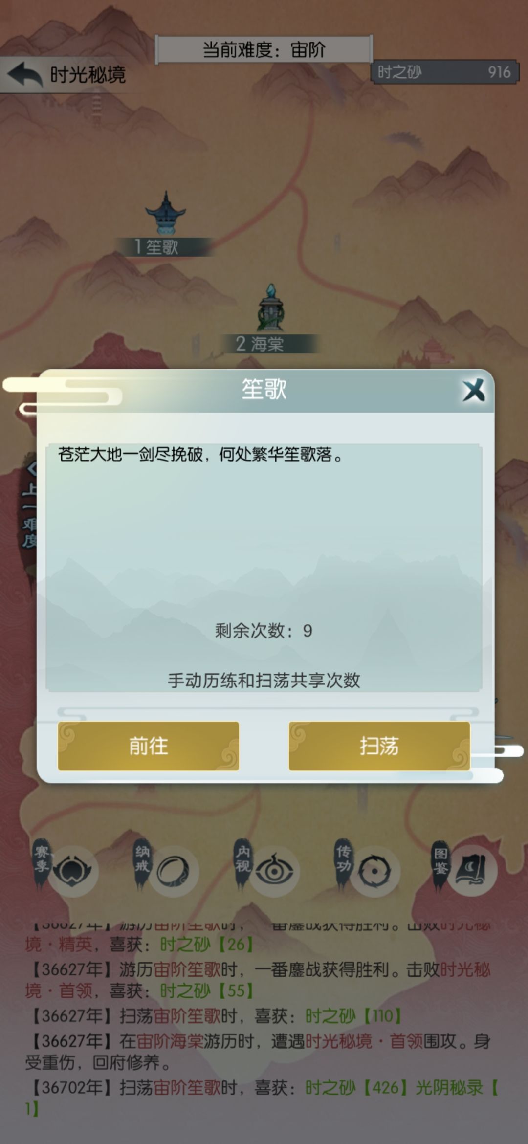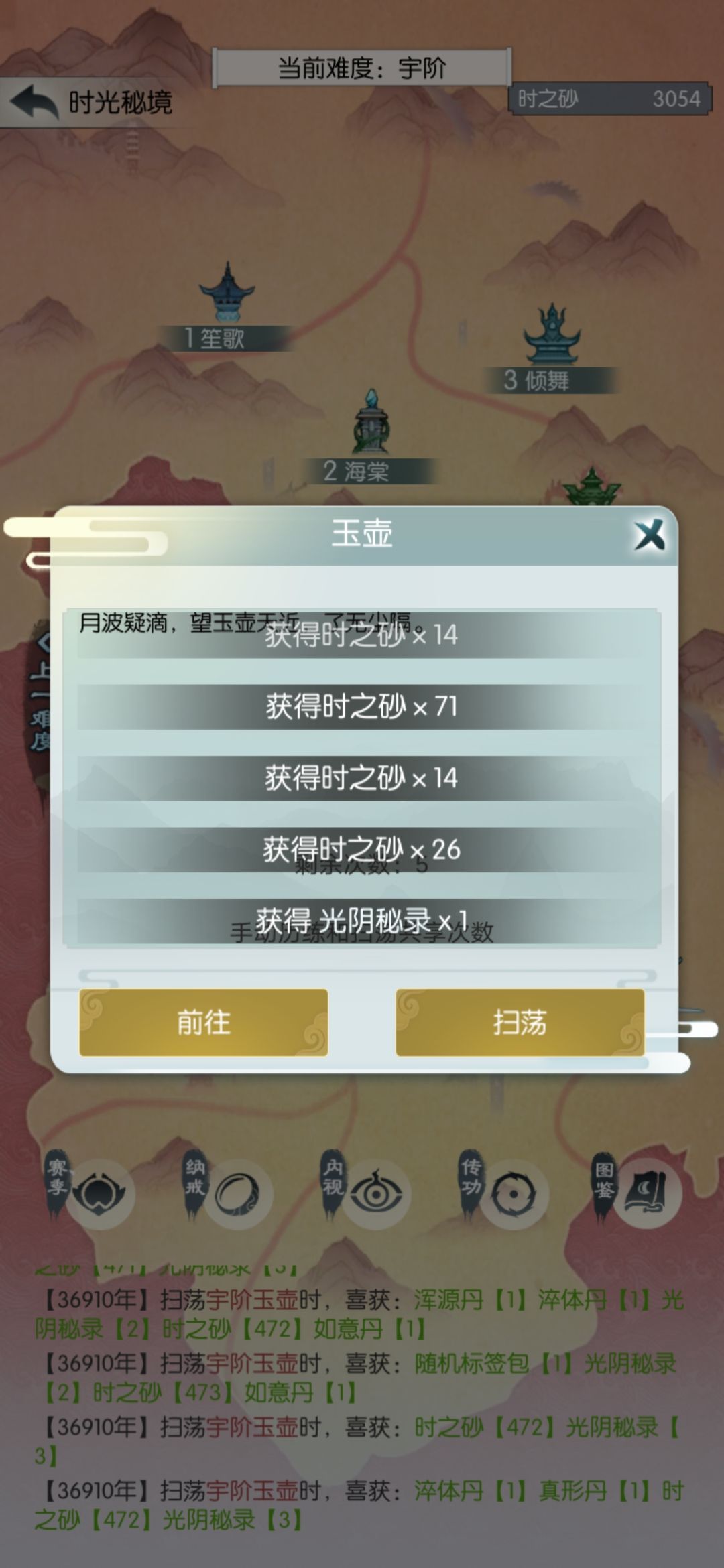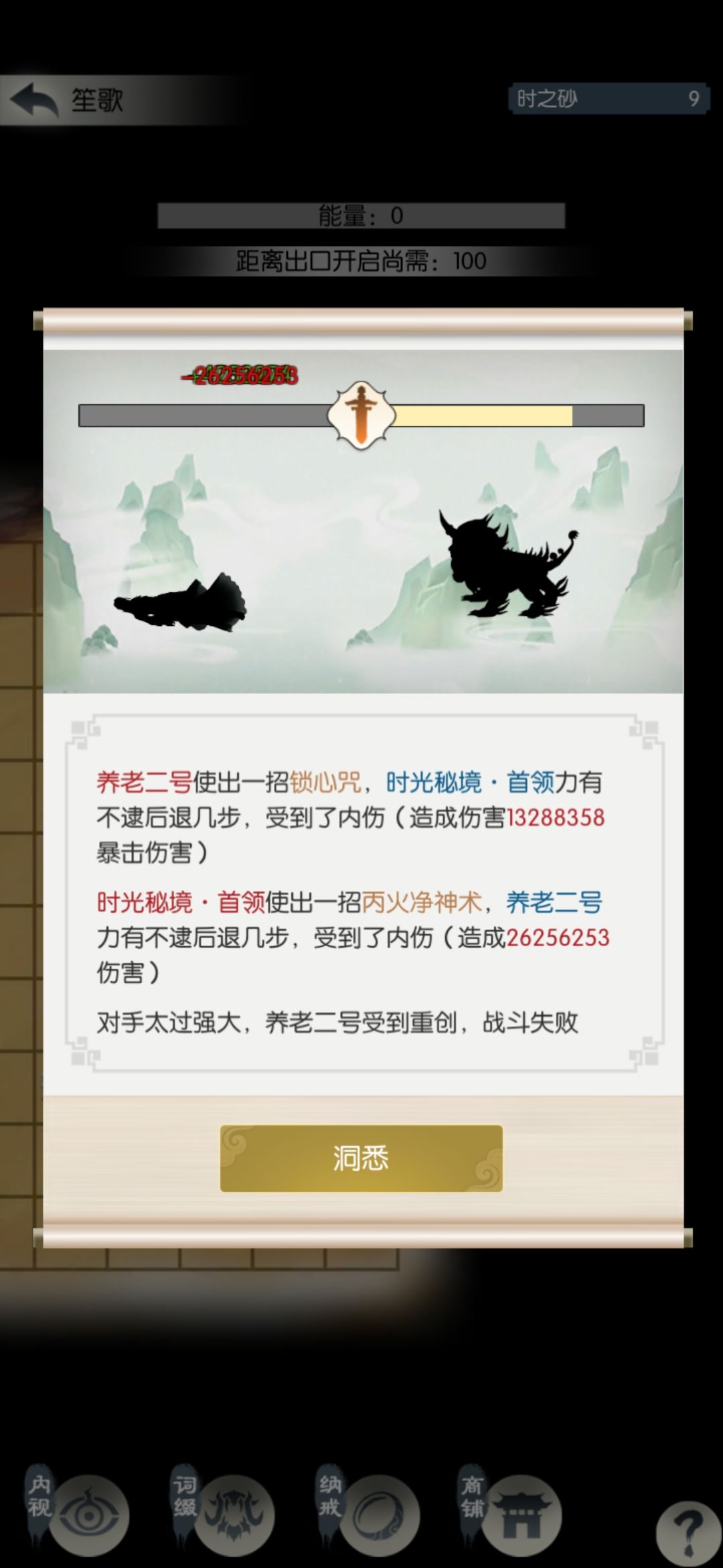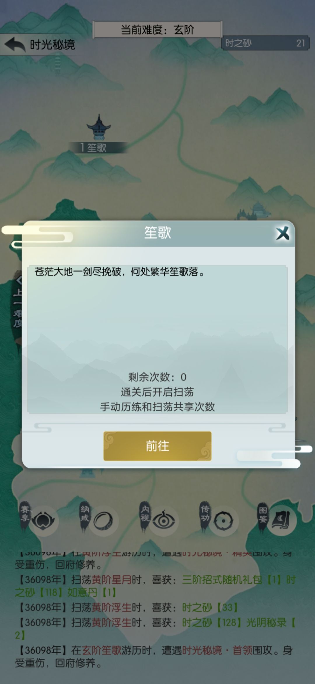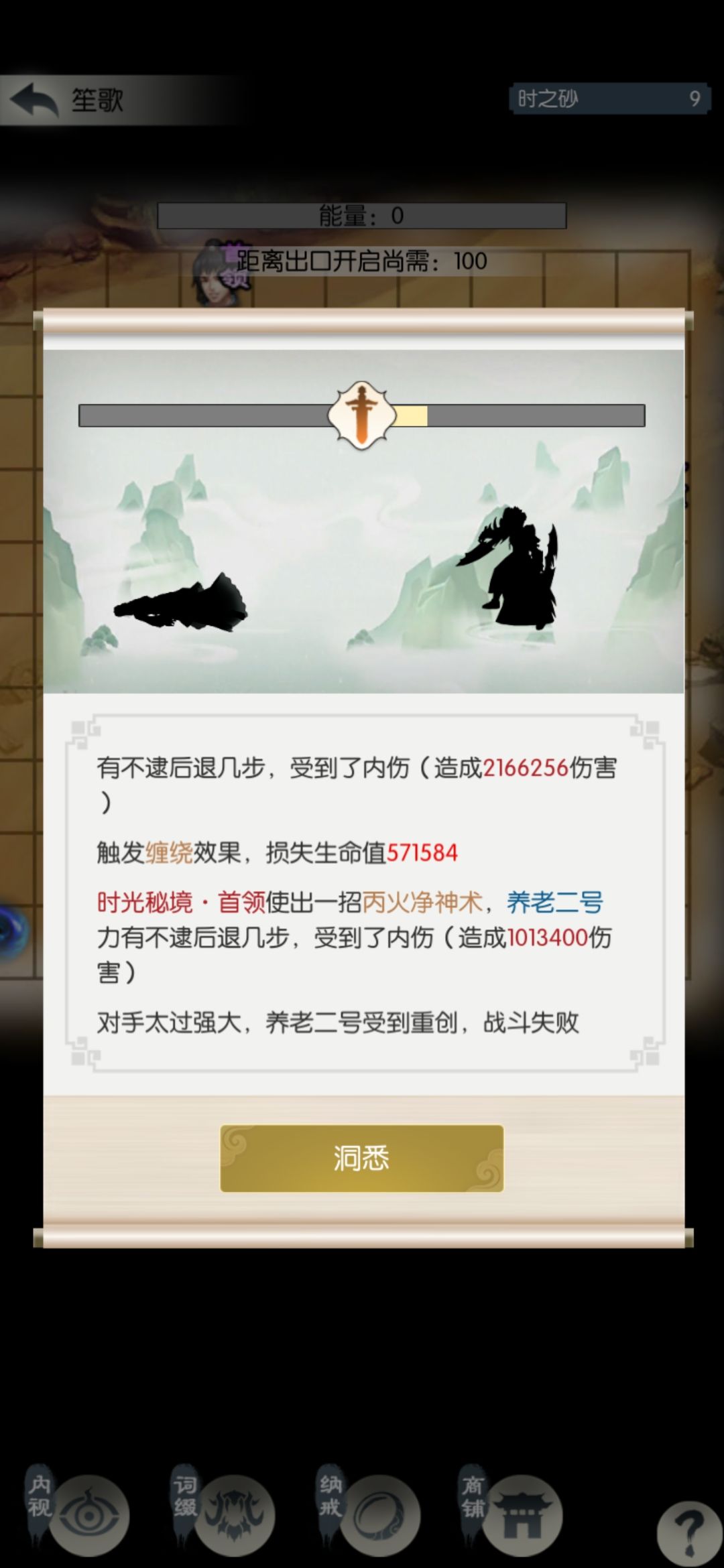 玄笙歌差点儿打过,没次数了。这个结果我有点不满意,今天搞砸了;可能应该第三天再买光阴密录,不过还在接受范围吧。