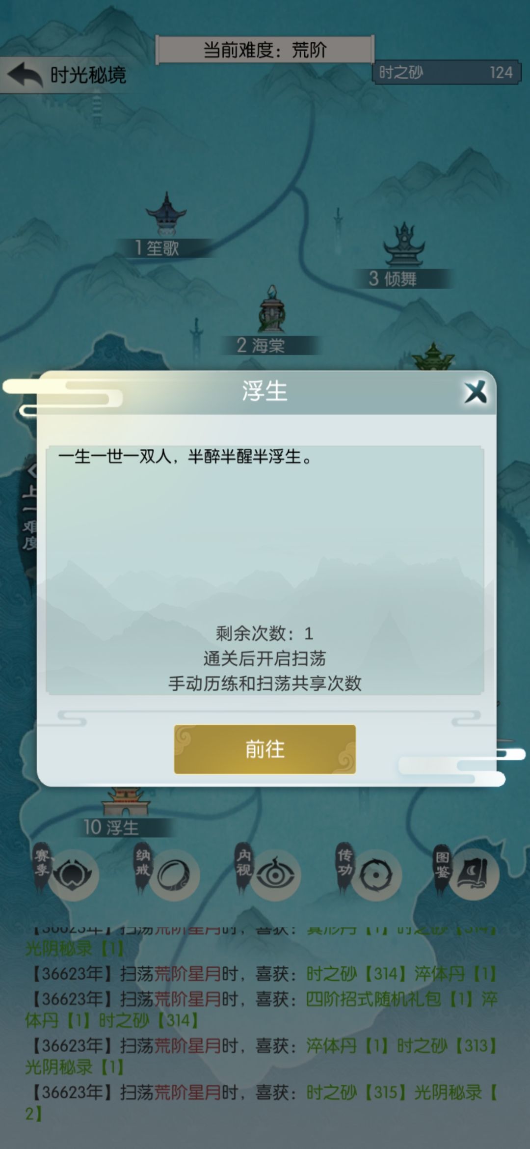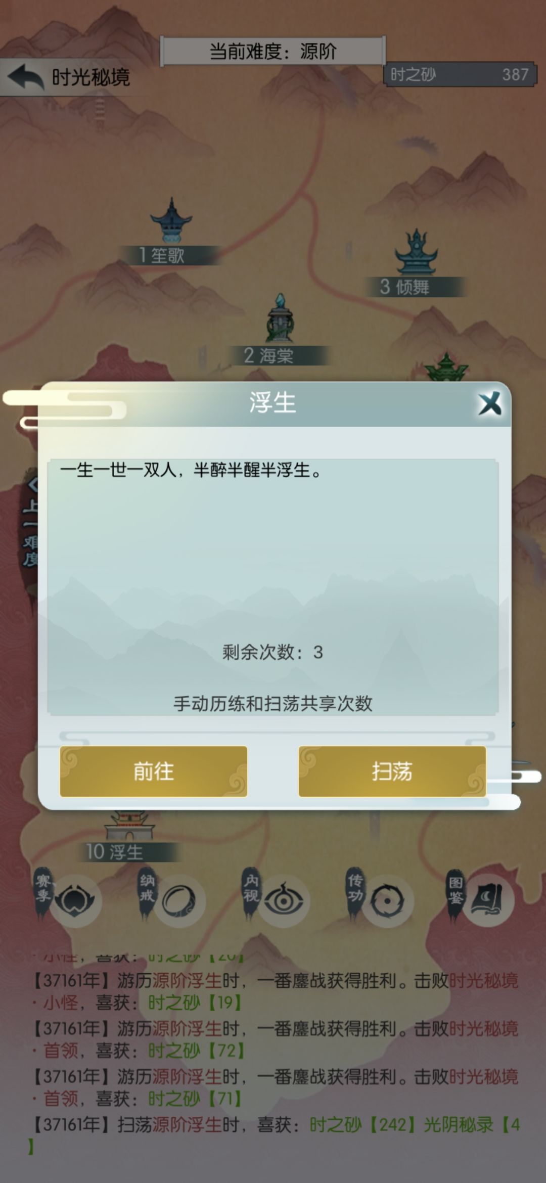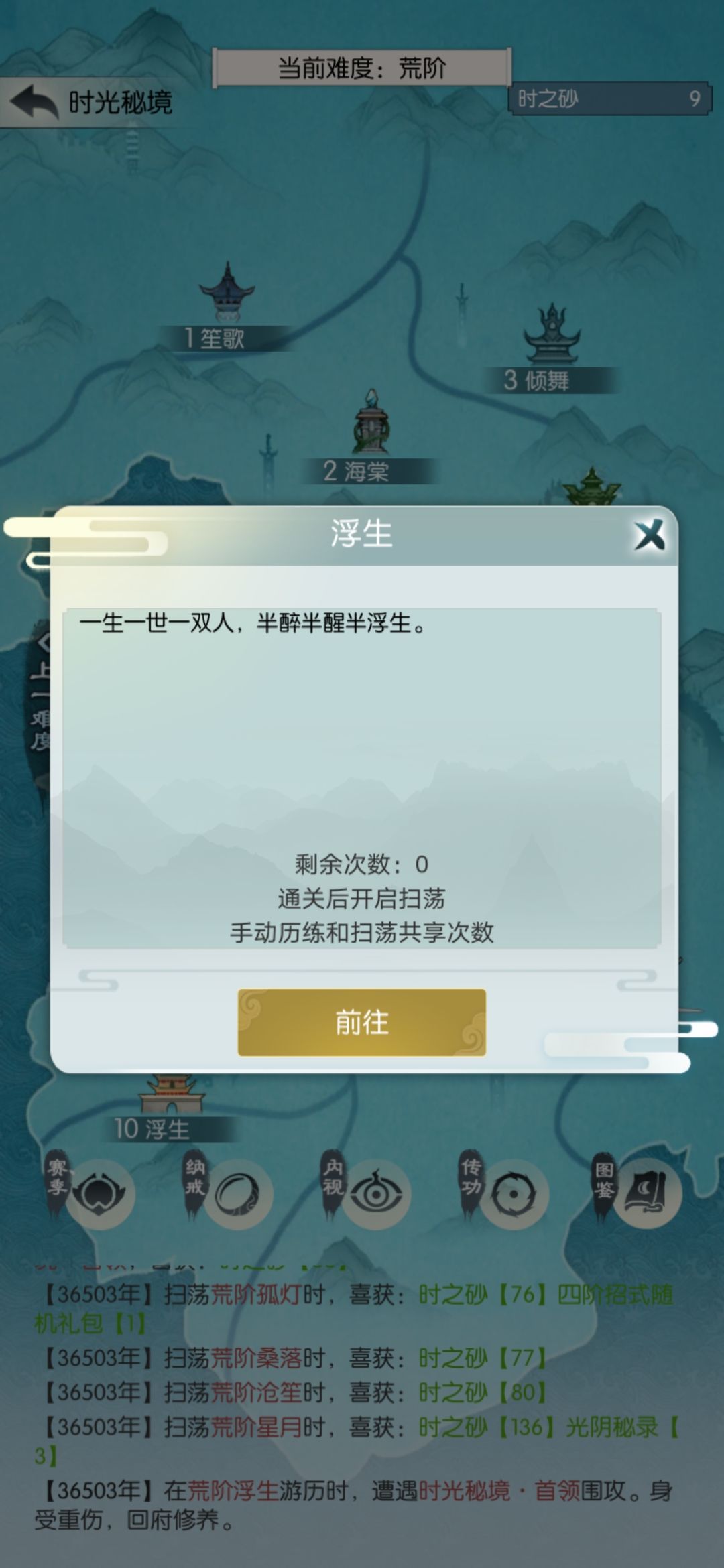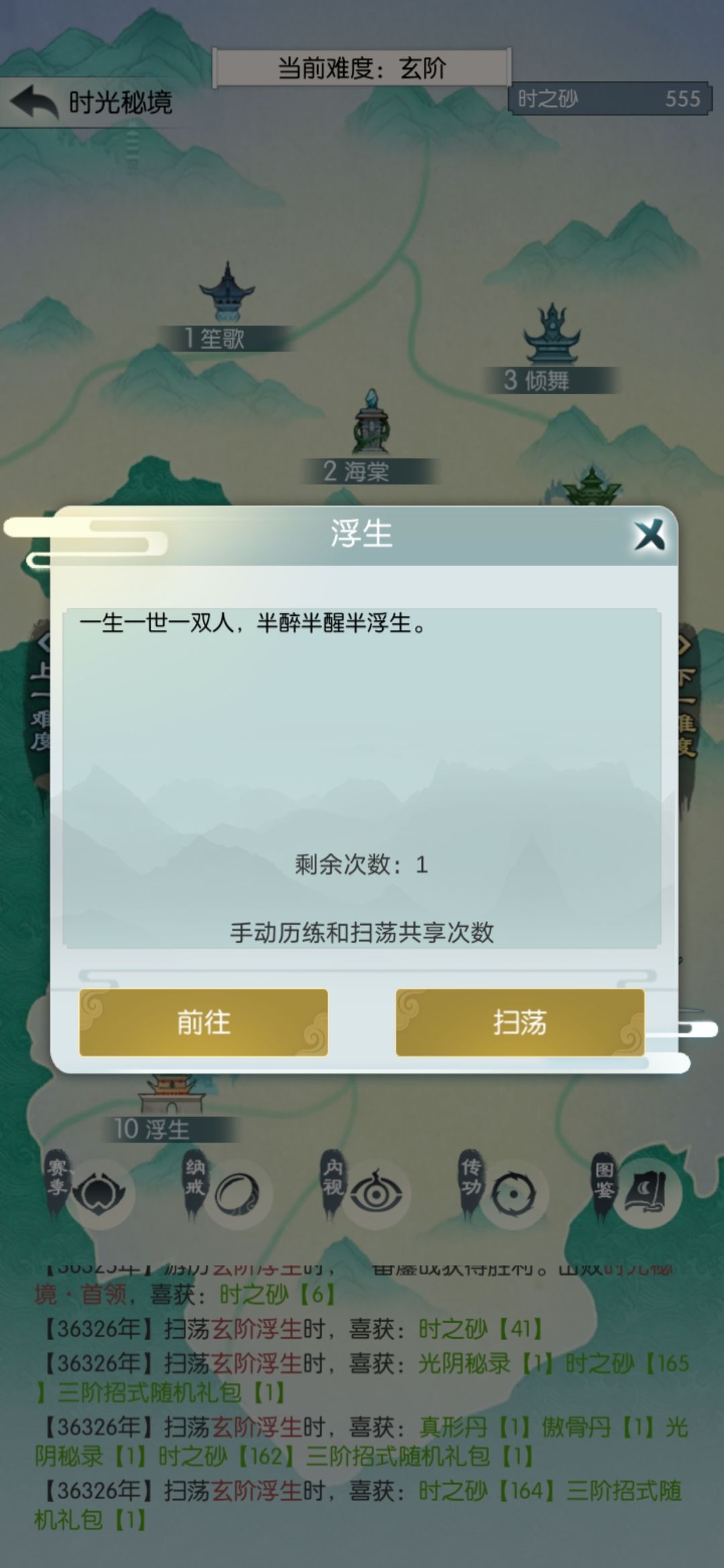 工资买属性,再次挑战玄桑落。通过之后扫荡两次再去下一关,如果翻车也是扫荡两次再挑战。就这样我到了玄浮生,还剩4次。为了保证过地笙歌,我决定扫3次再挑战。