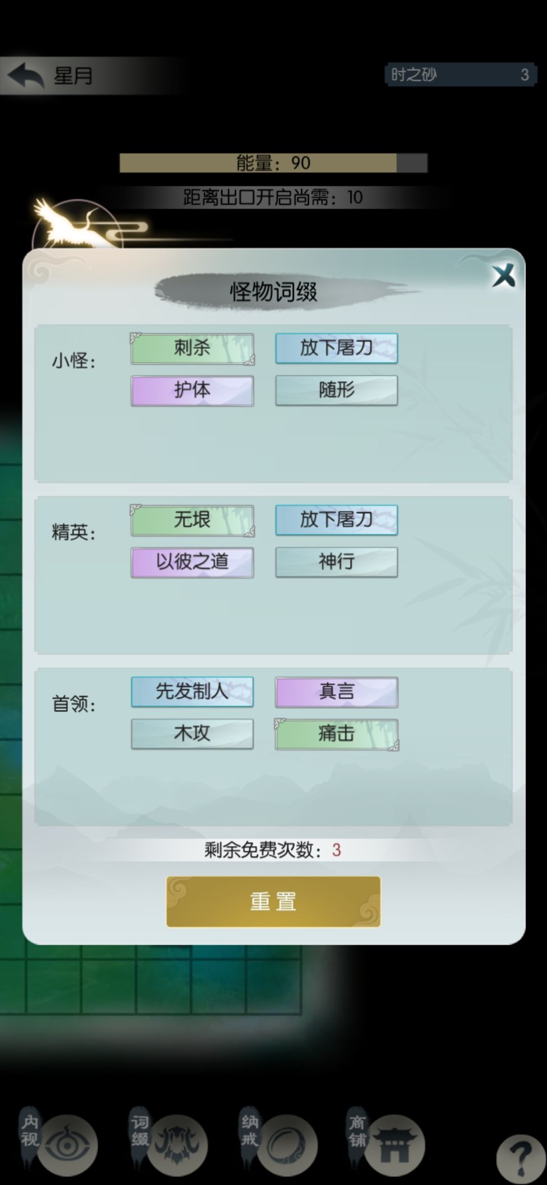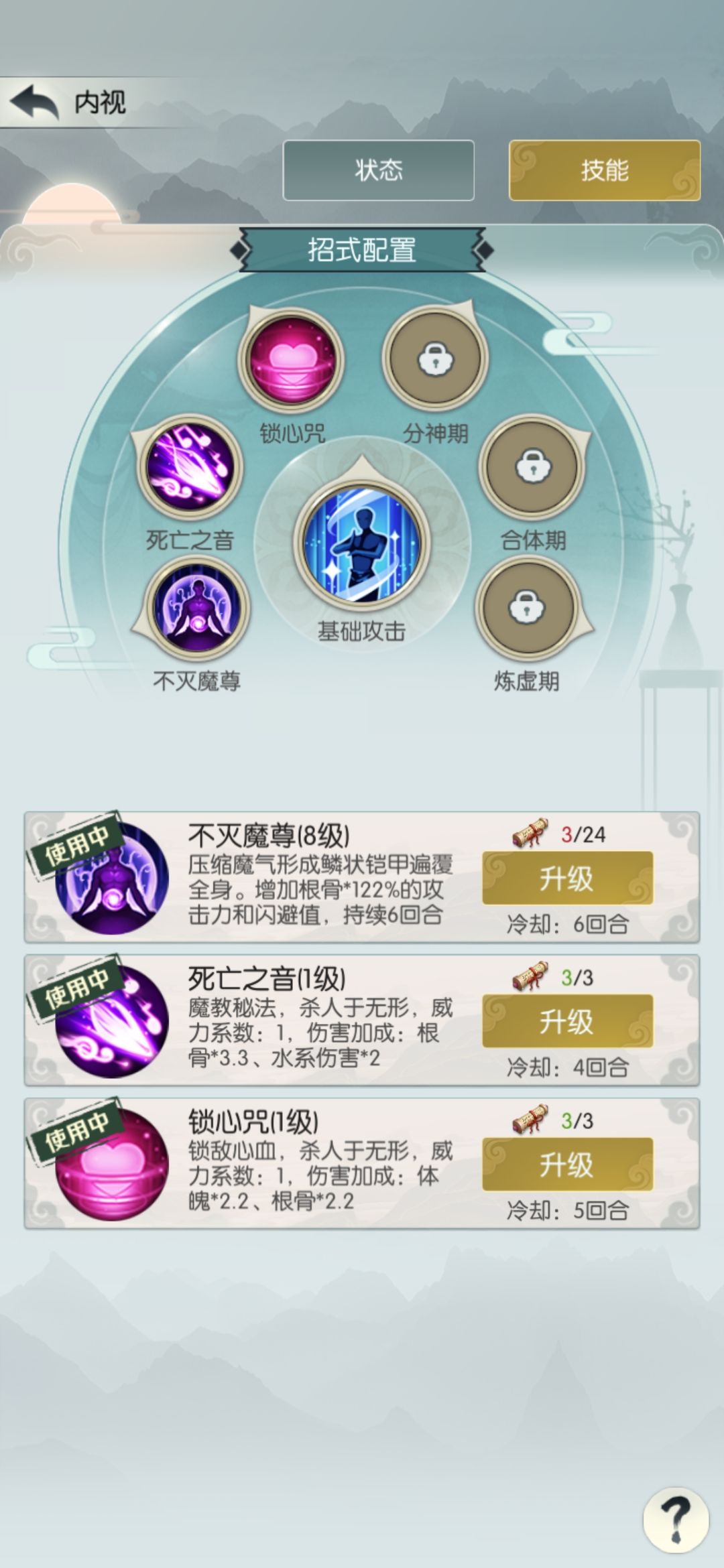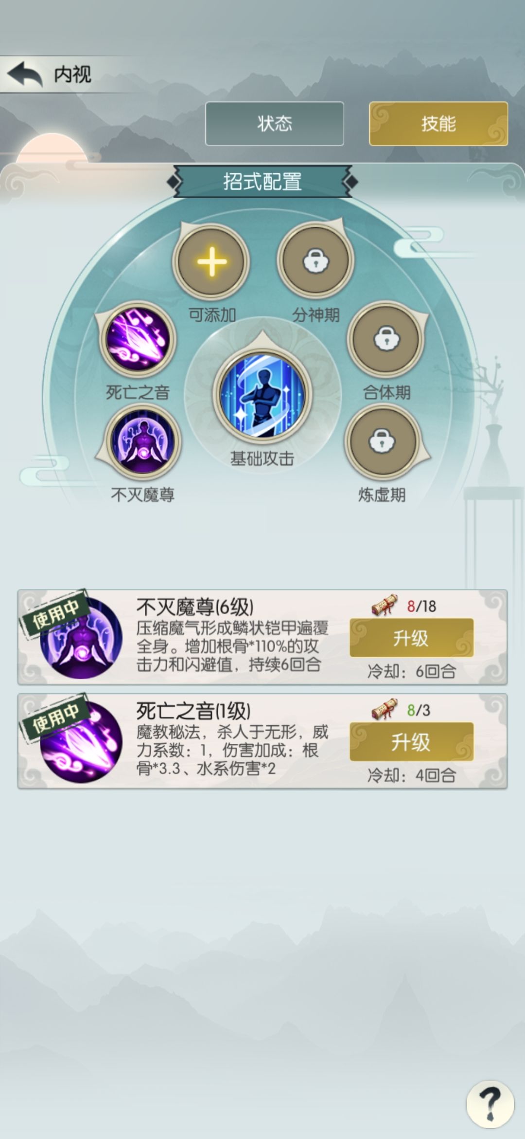 四个核心词缀已买三个,我已成气候,继续冲关。中途把境界提到分神一,能有四个招式格子,最多开五个格子,也就是合体一。