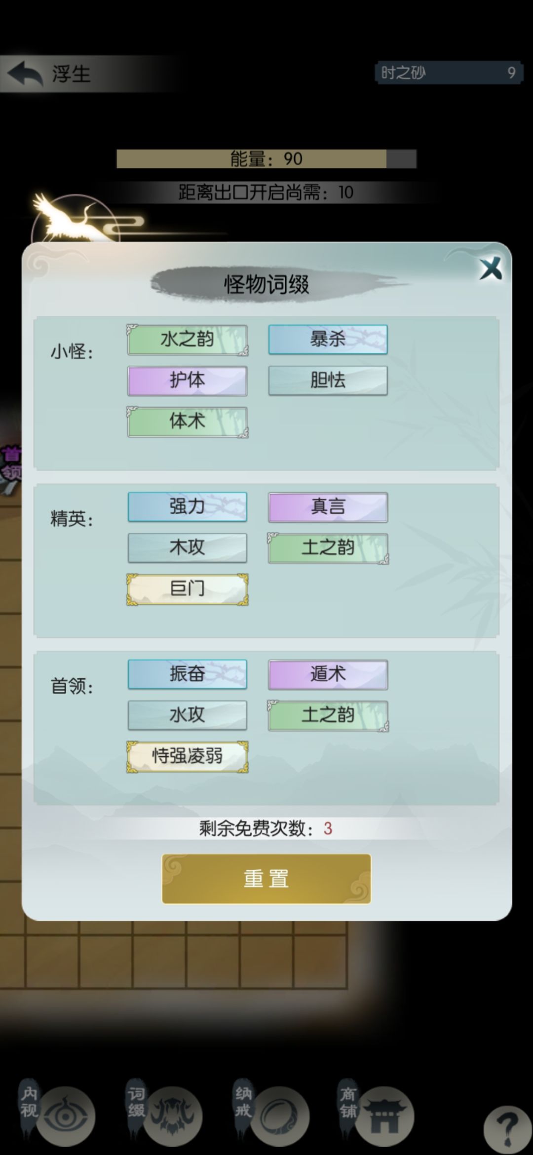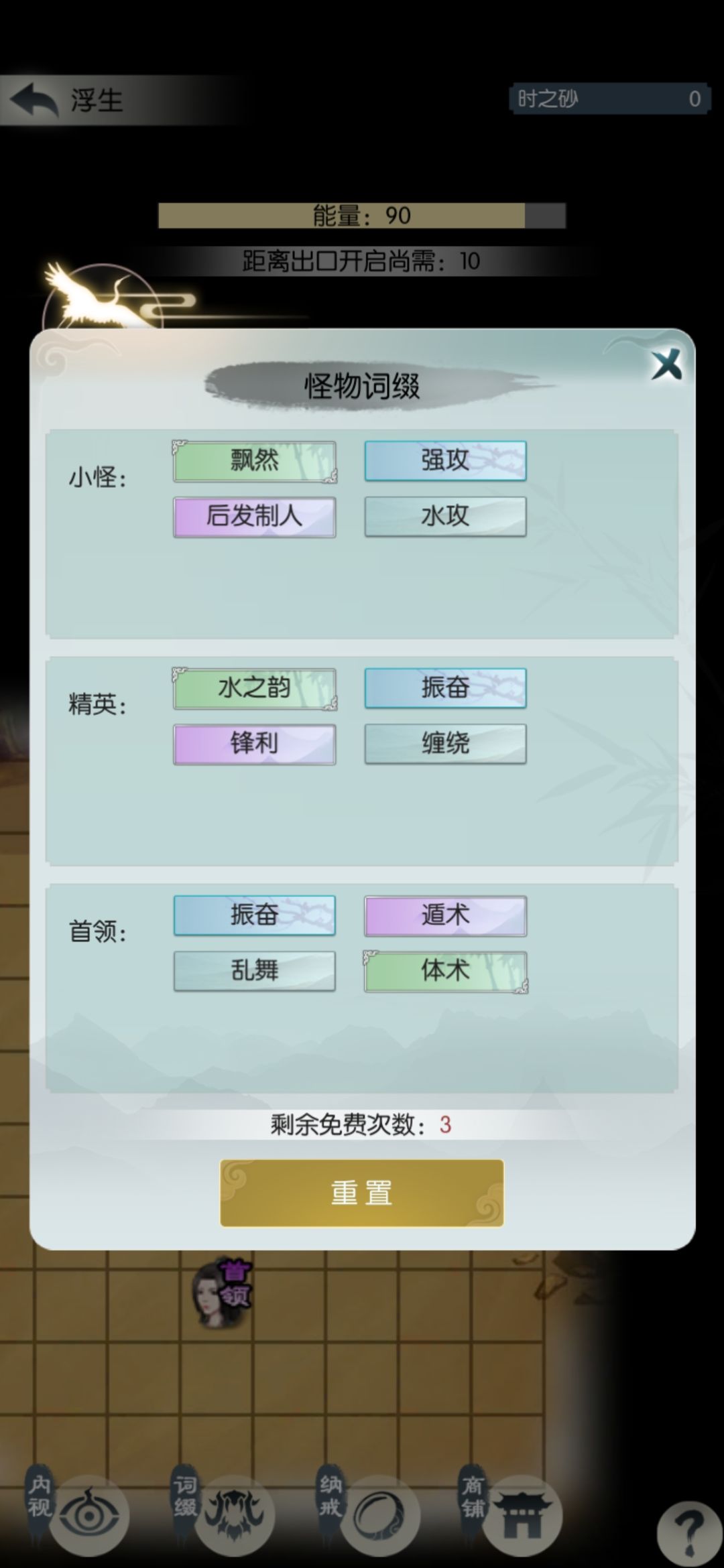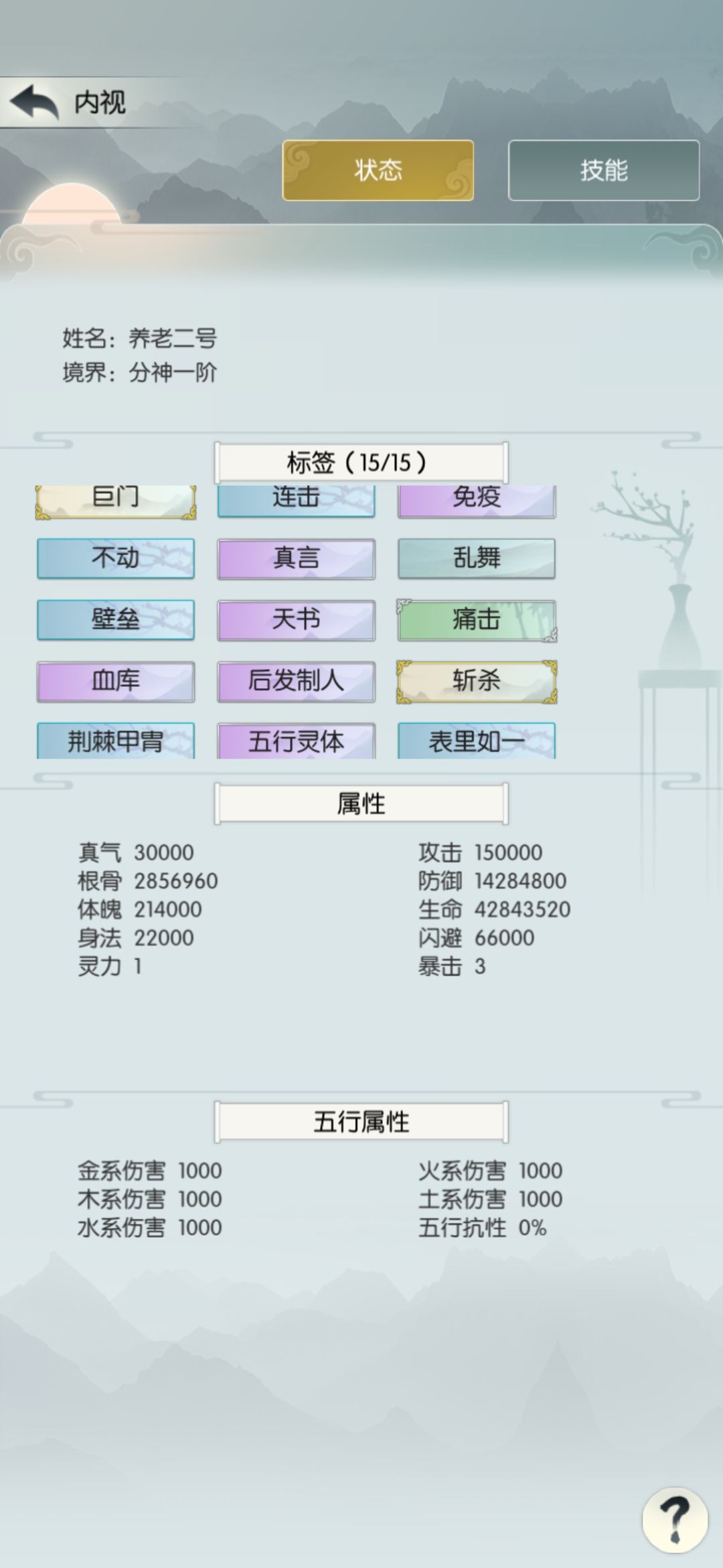 四个核心词缀已买三个,我已成气候,继续冲关。中途把境界提到分神一,能有四个招式格子,最多开五个格子,也就是合体一。