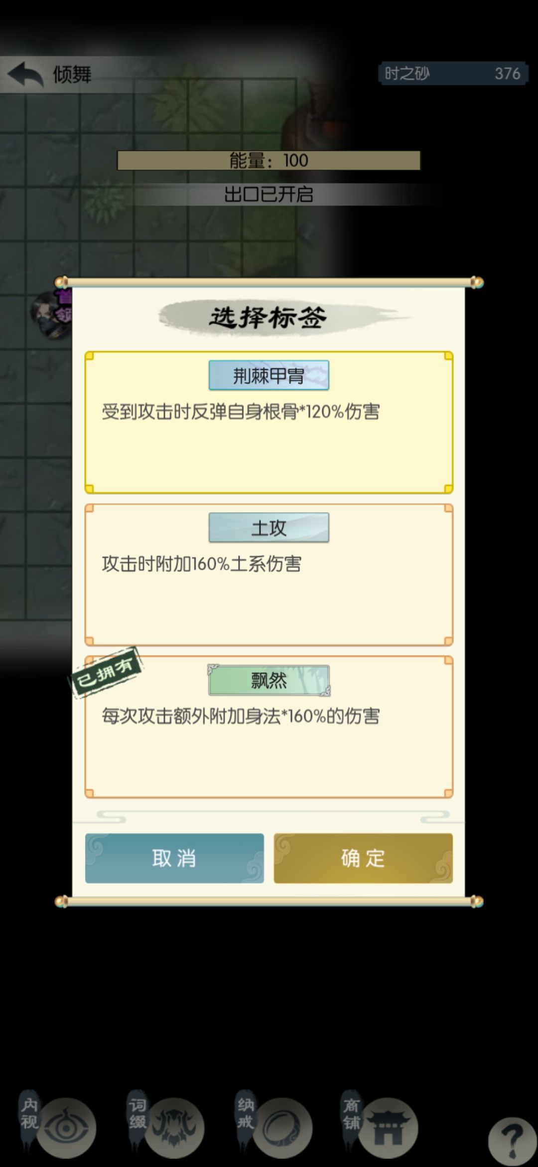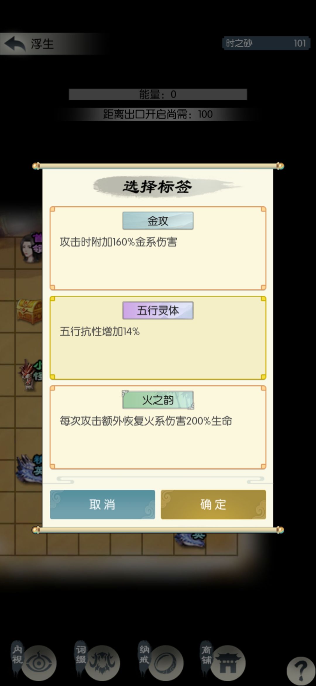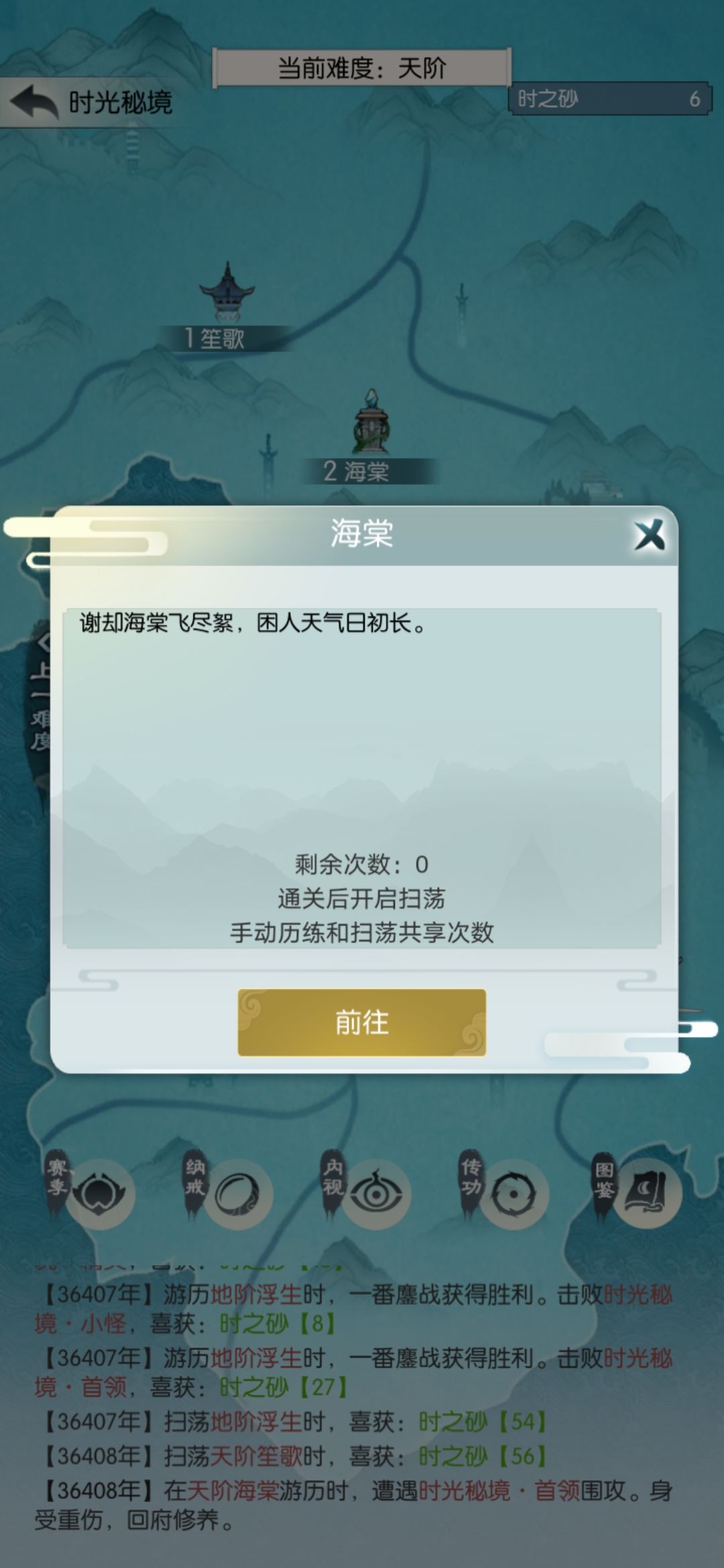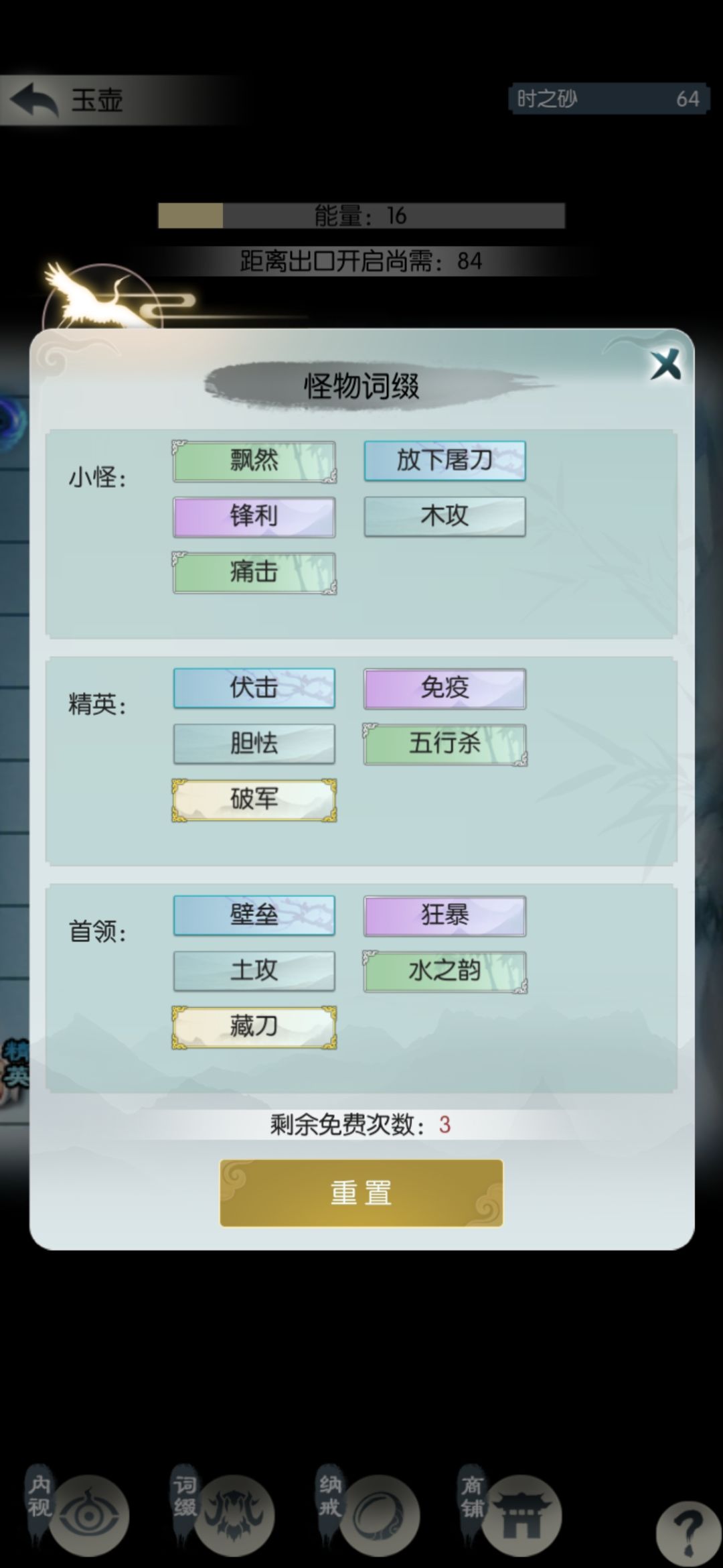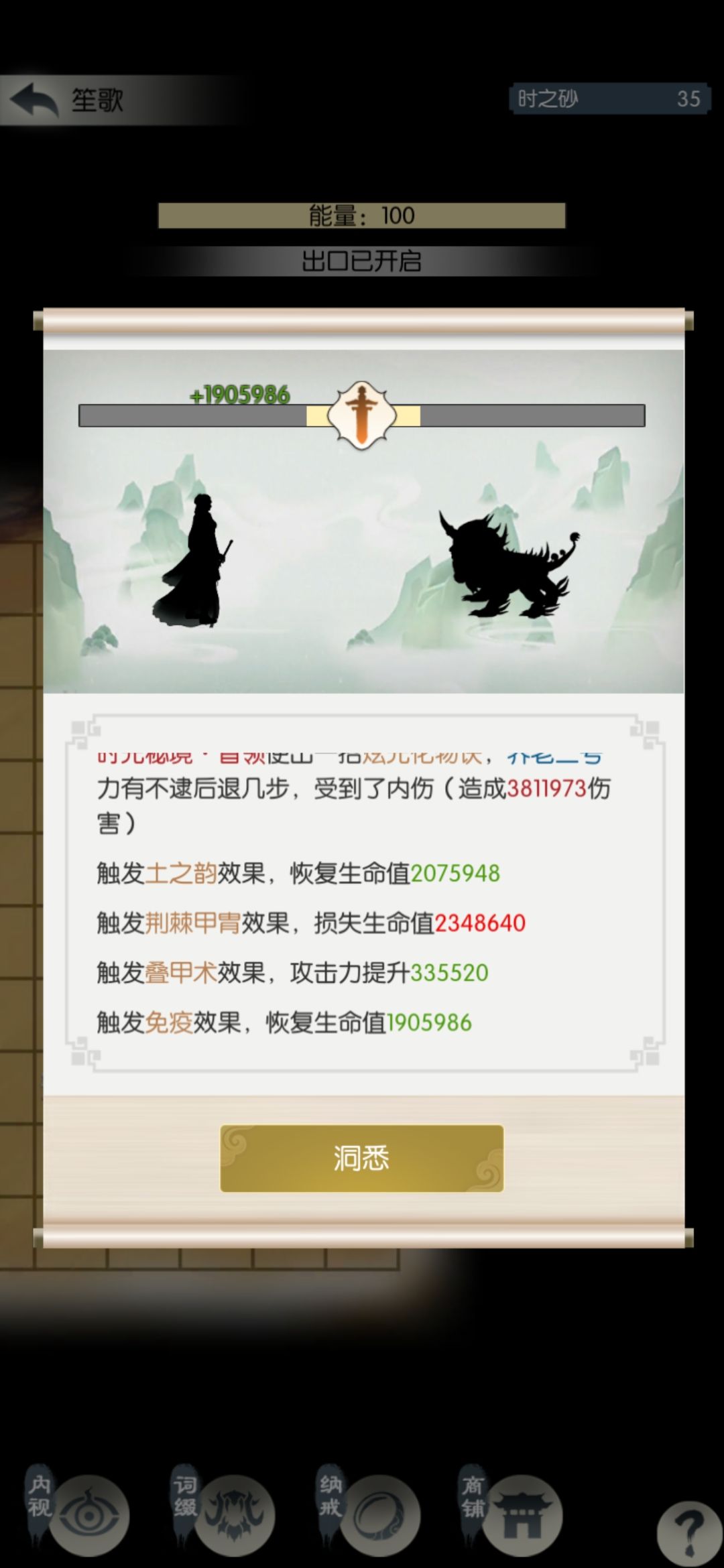 这一半的砂子相当于扫荡了1.5次,继续打一关扫荡一次。遇到根骨、防御、吸血、回血相关的词缀拿一下,我昨天拿了不动(人称小巨门,比较重要)和叠甲术(可选),今天什么也没有。