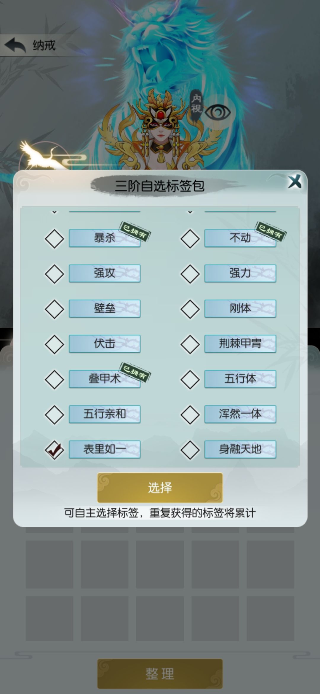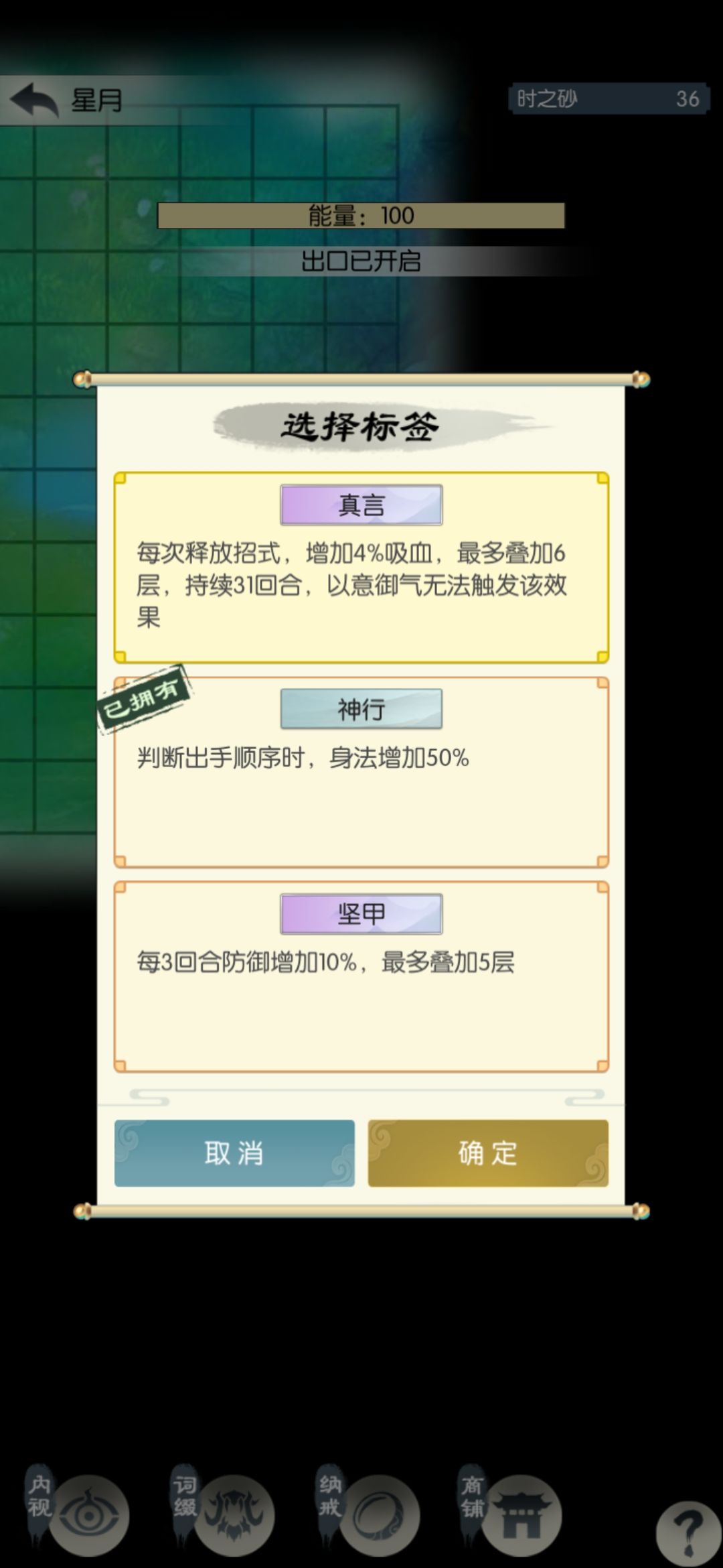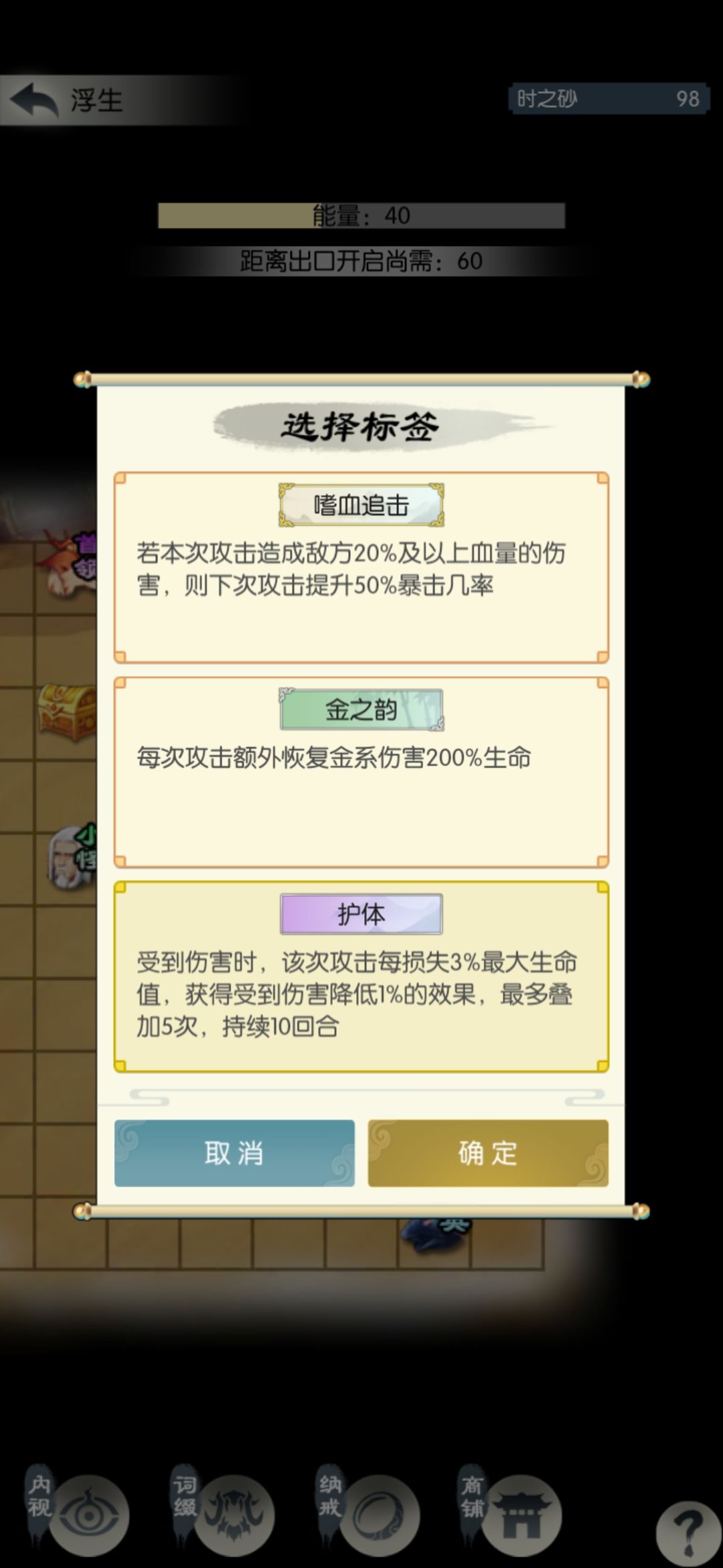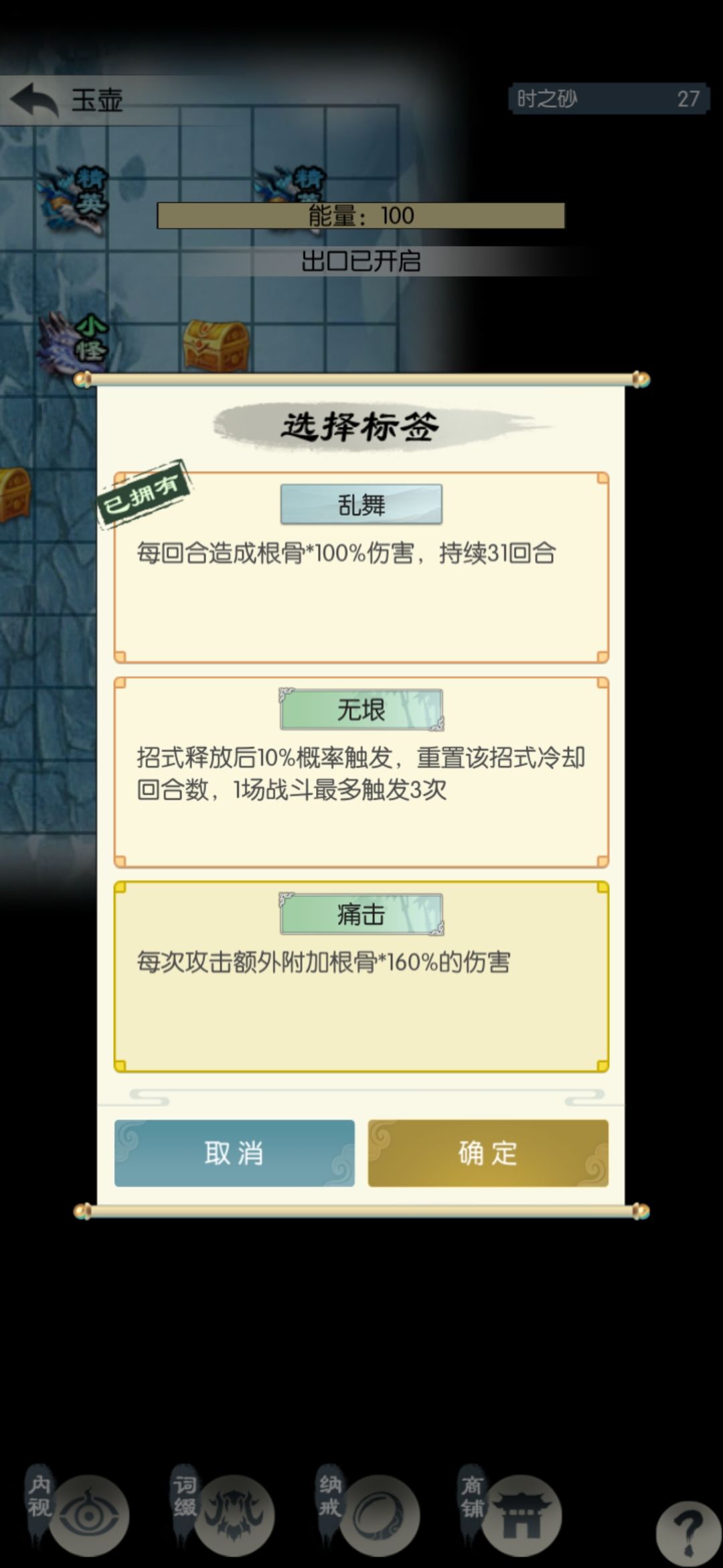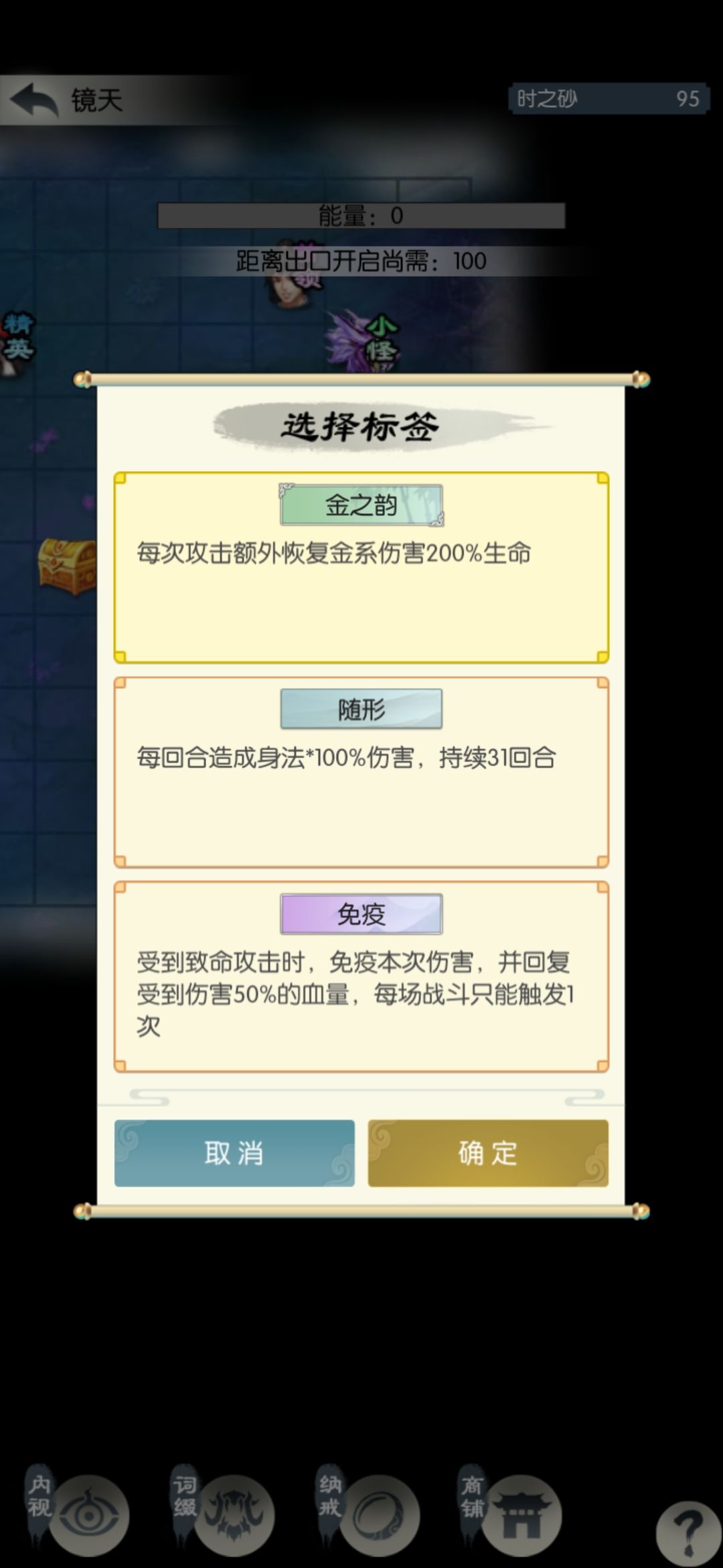 这一半的砂子相当于扫荡了1.5次,继续打一关扫荡一次。遇到根骨、防御、吸血、回血相关的词缀拿一下,我昨天拿了不动(人称小巨门,比较重要)和叠甲术(可选),今天什么也没有。