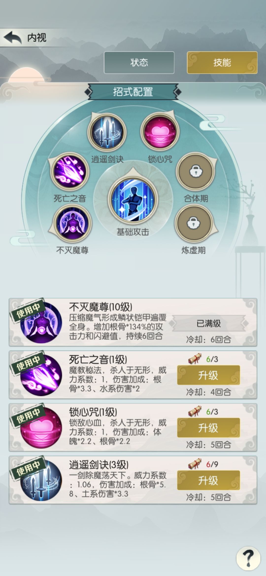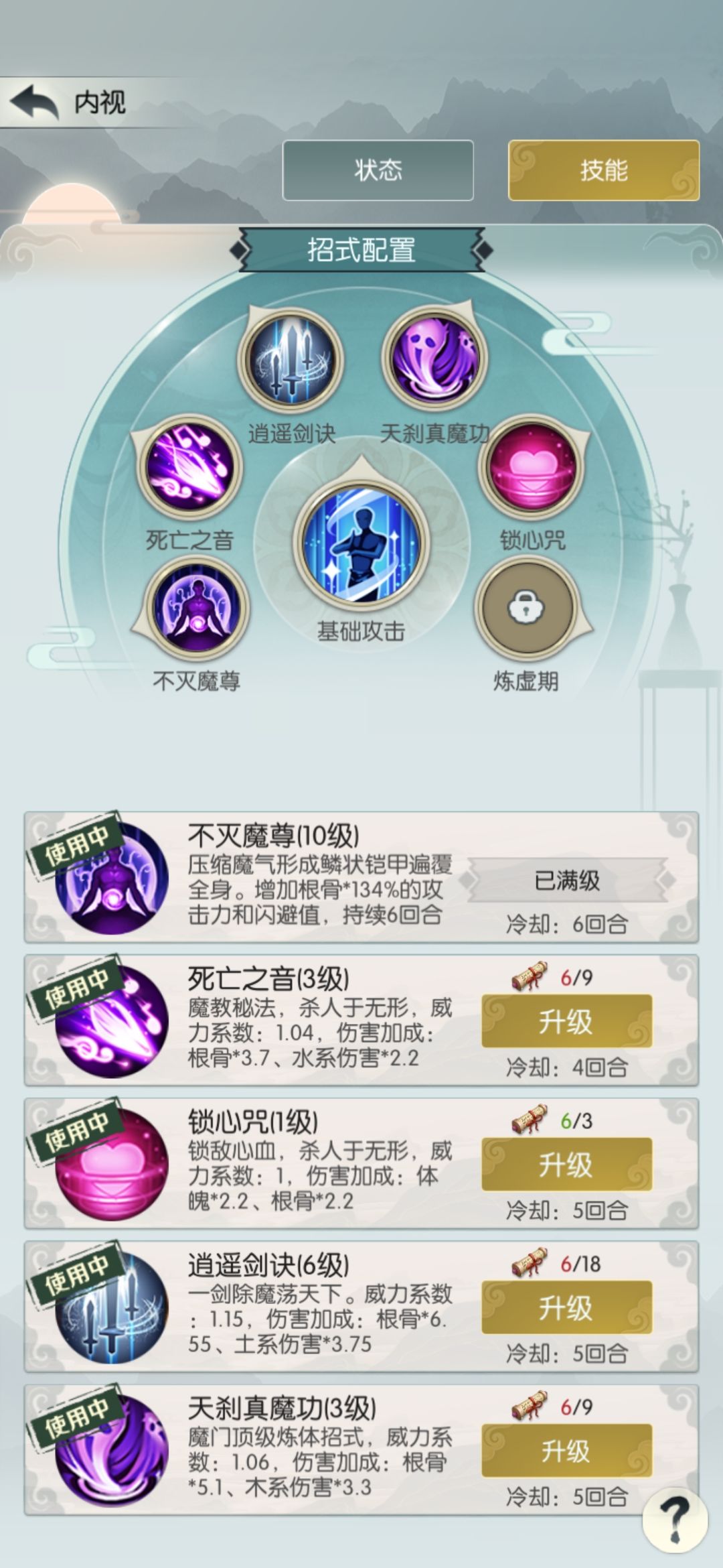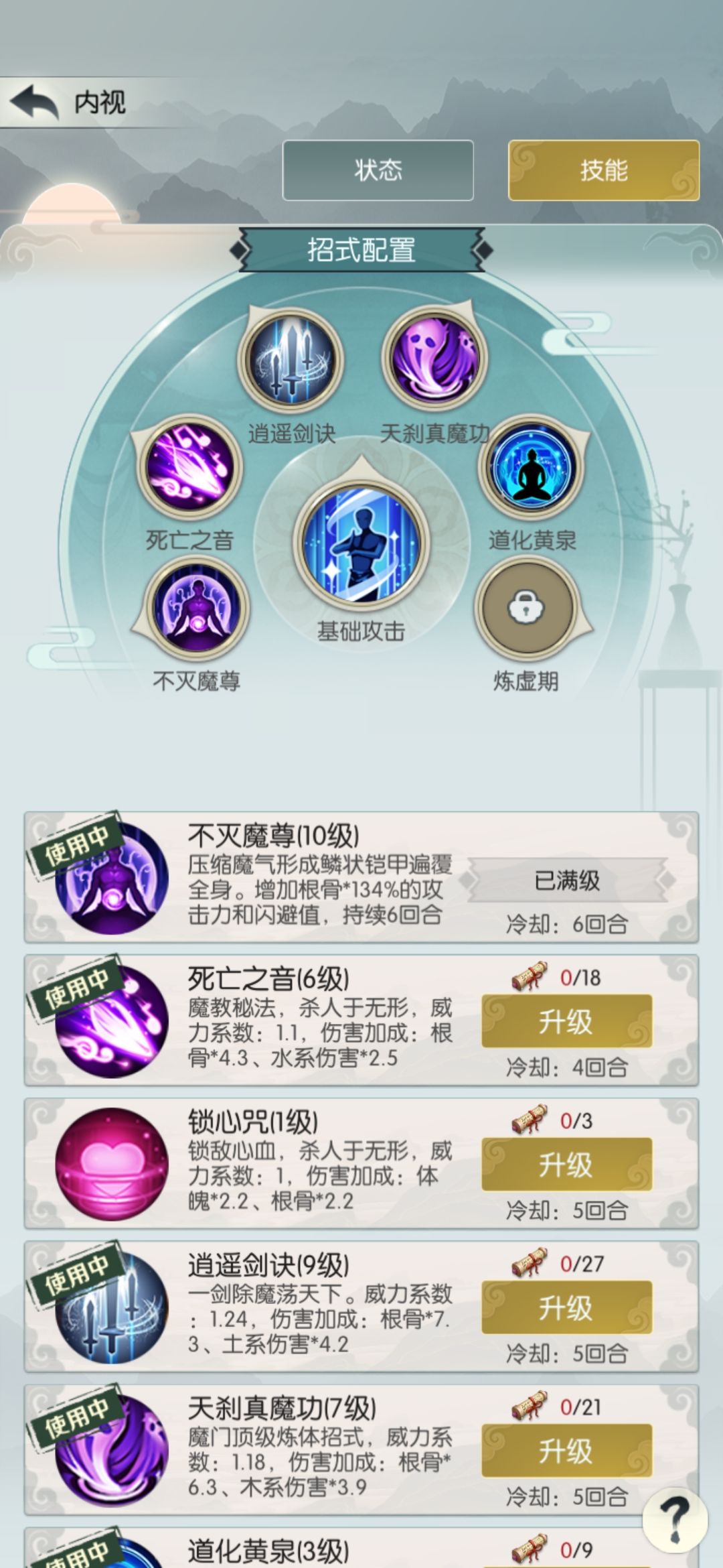 中途发现现在只掉落五阶招式了,就花140买个四阶招式天刹真魔功,顺便把境界升到合道一,之后不再提境界。招式基本上不改了。