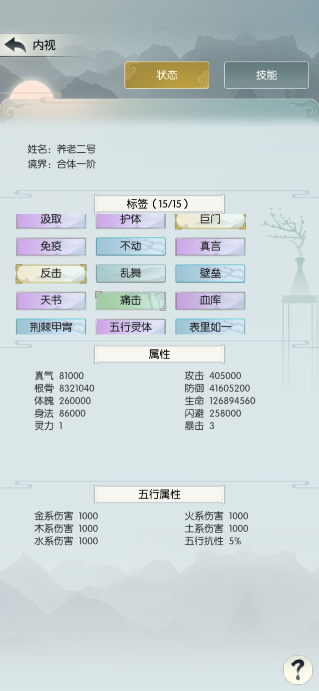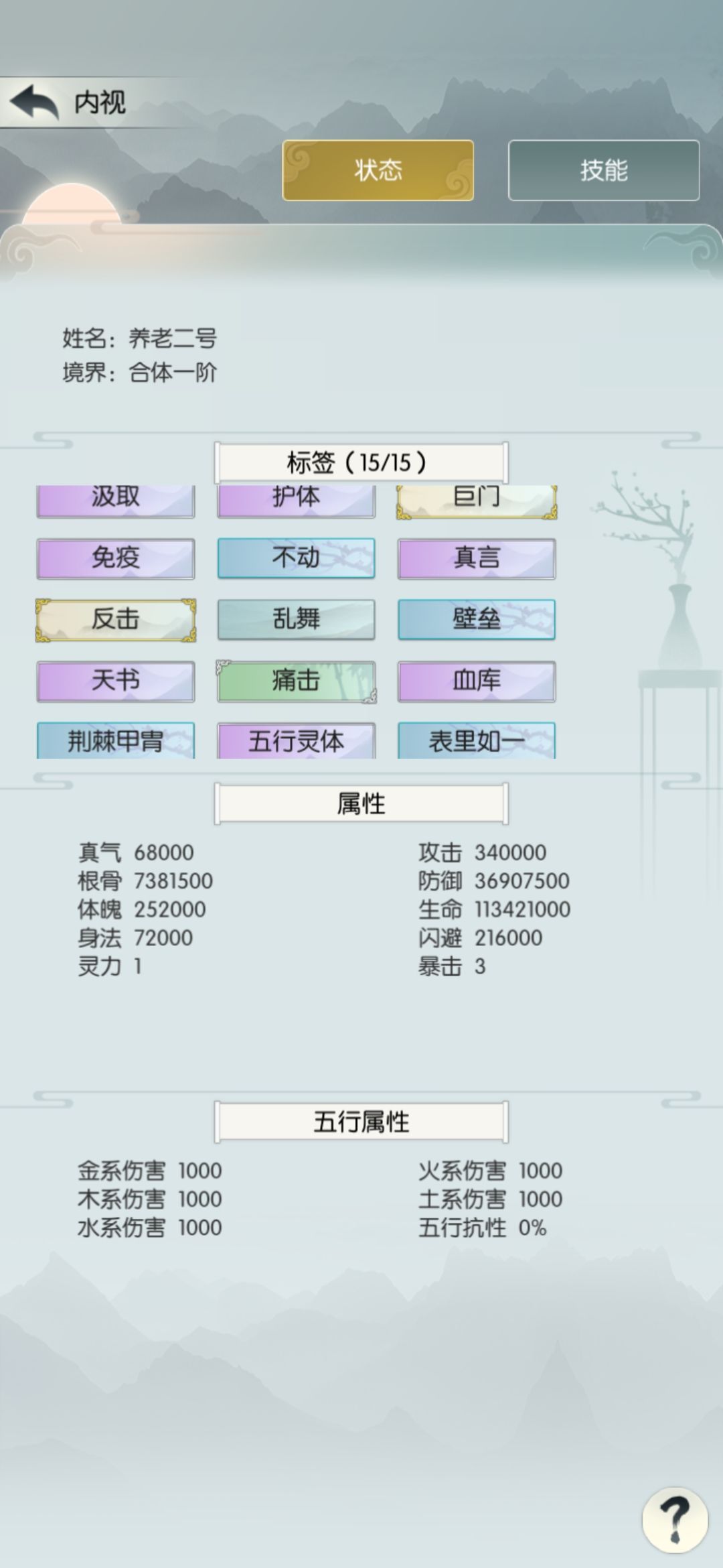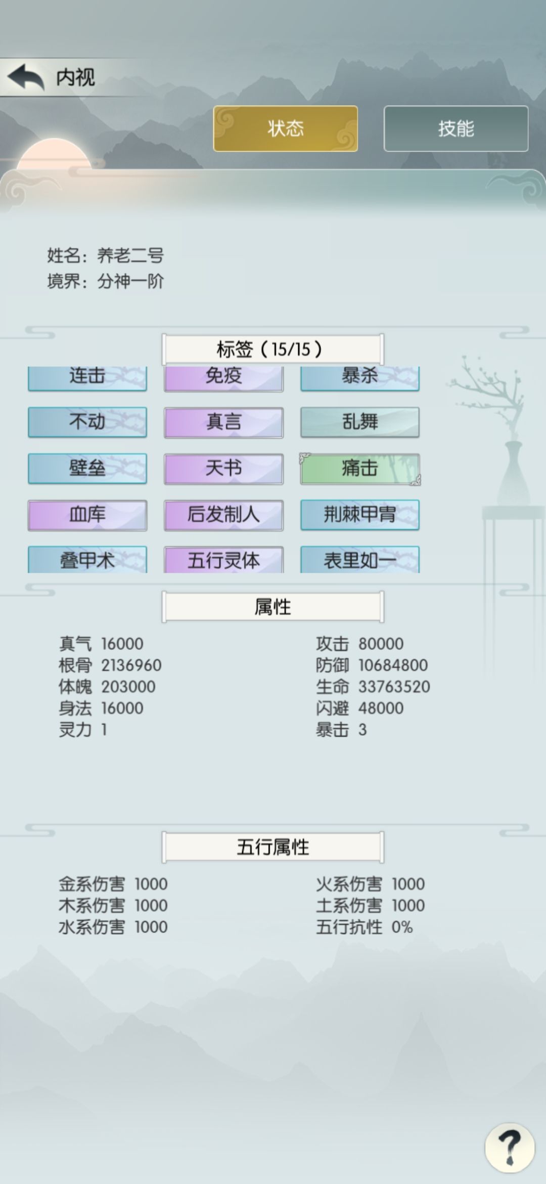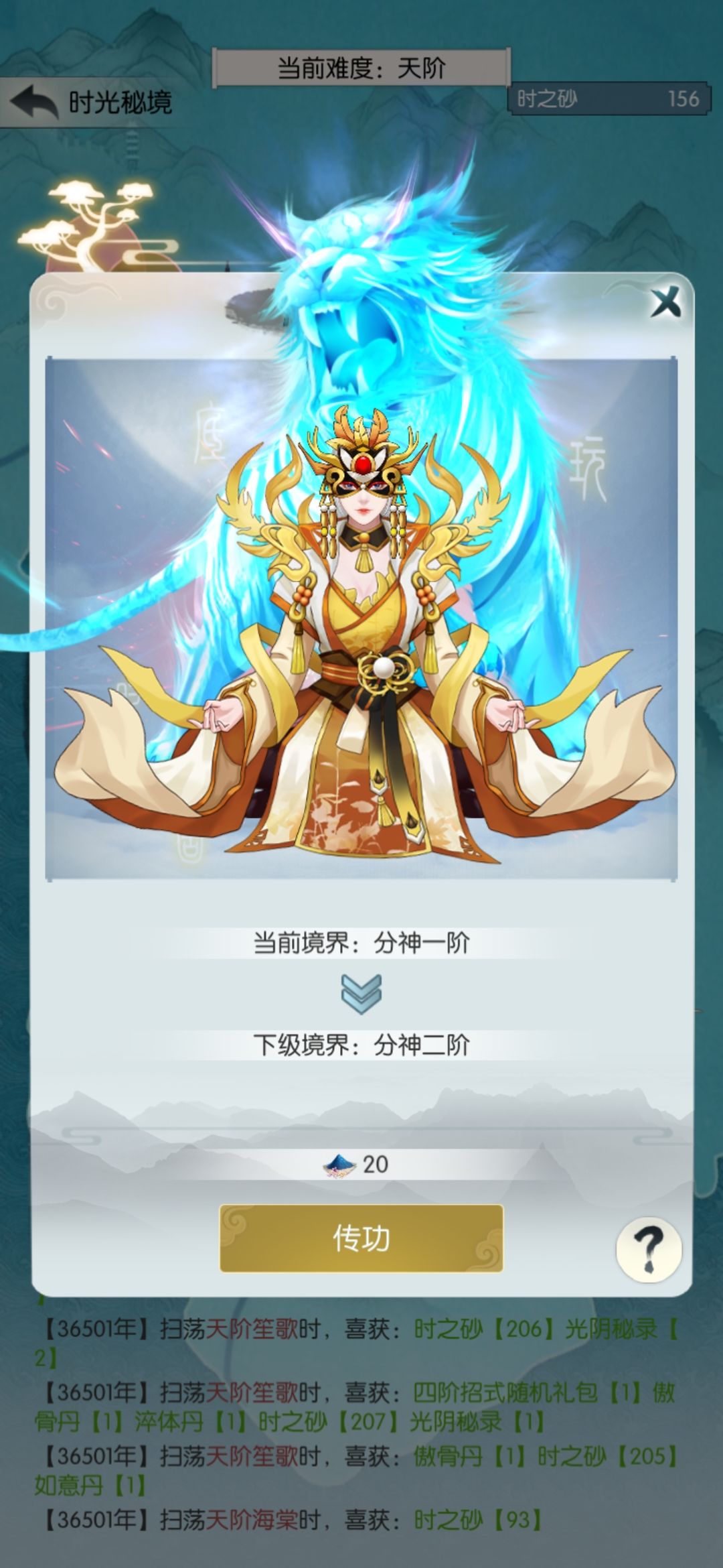 中途发现现在只掉落五阶招式了,就花140买个四阶招式天刹真魔功,顺便把境界升到合道一,之后不再提境界。招式基本上不改了。