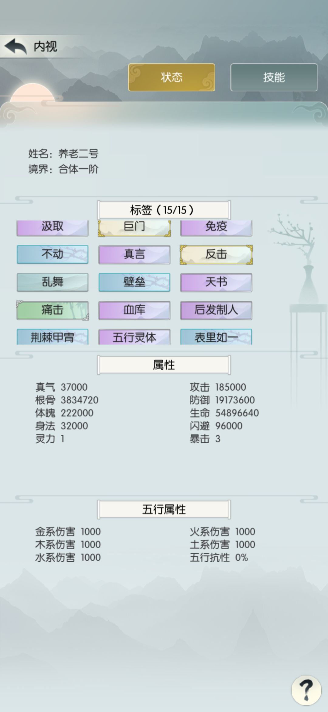 。总结:根骨流还是稳定的,只要把根骨堆起来,攻防一体。不灭加四输出的思路是:对面打我们不破防,真伤的伤害靠吸血吸回来,真言加汲取能有个30%以上很可观。但是这次暴露出一大问题,后期命中低,加上破军振奋等等词缀让不破防达不成,导致我在源阶屡屡翻车。这情况可以堆点抗性解决,在买了巨门之后每天买满抗性丹,起手抗性招式—五行乾坤决。词缀方面就不用拿吸血相关,欢欣变得比较重要。具体就让各位同道自行探索了。当然,像我上面那样不灭加四输出也是稳过的,只要你根骨够高。