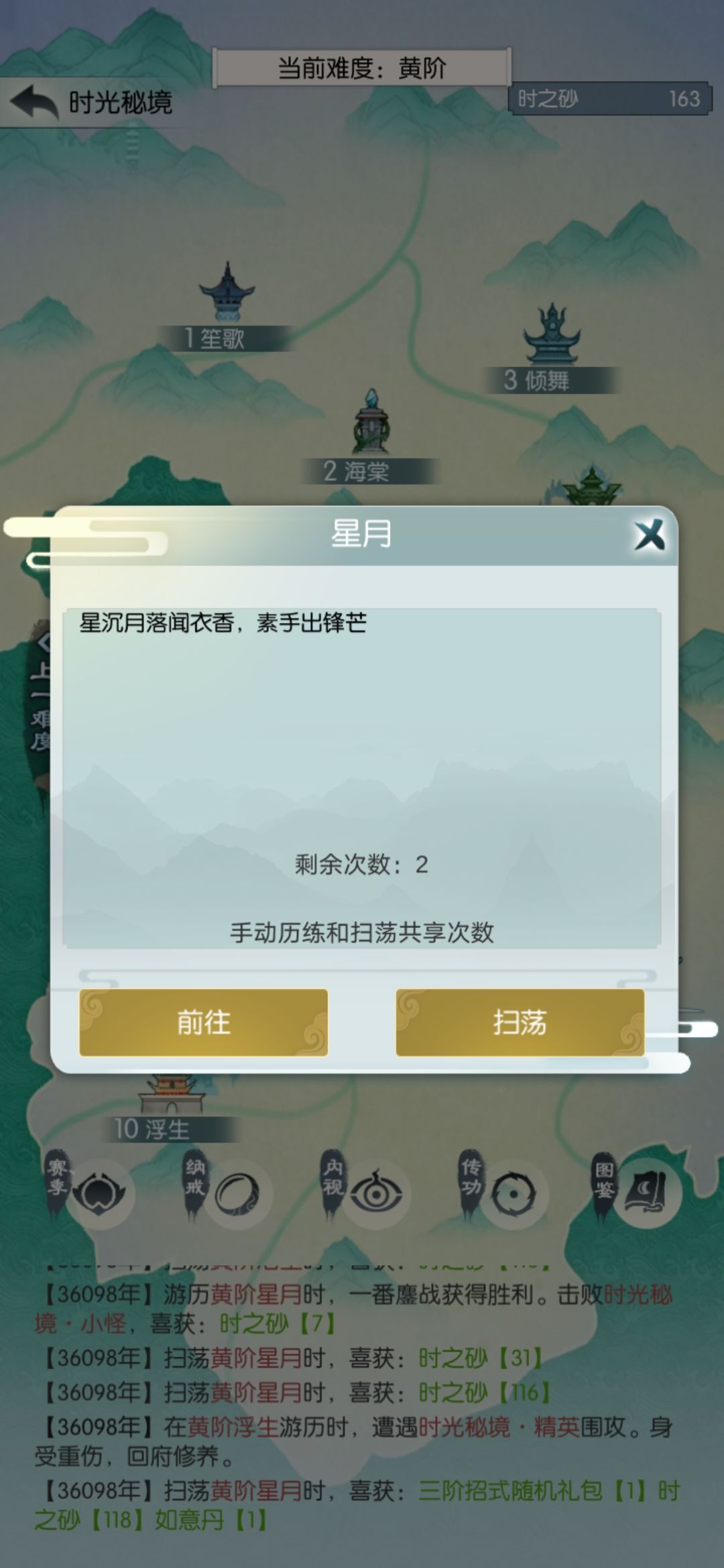 开箱拿到第二个根骨招式锁心咒,算是比较晚,赶紧换上。打到黄浮生翻车了,扫荡星月一次继续打。