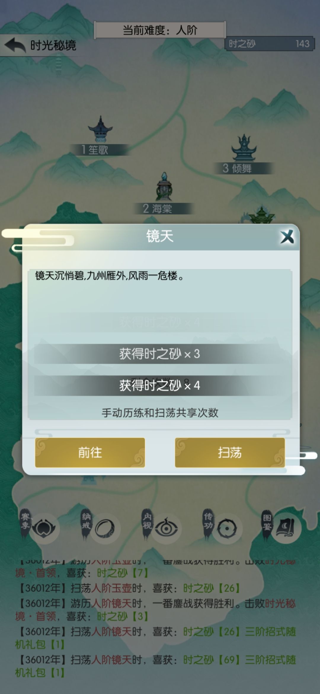 人镜天开始打完一关扫荡一次,买属性丹。多扫荡少翻车,翻车一次少一半砂子。翻车了也扫荡一次再打。