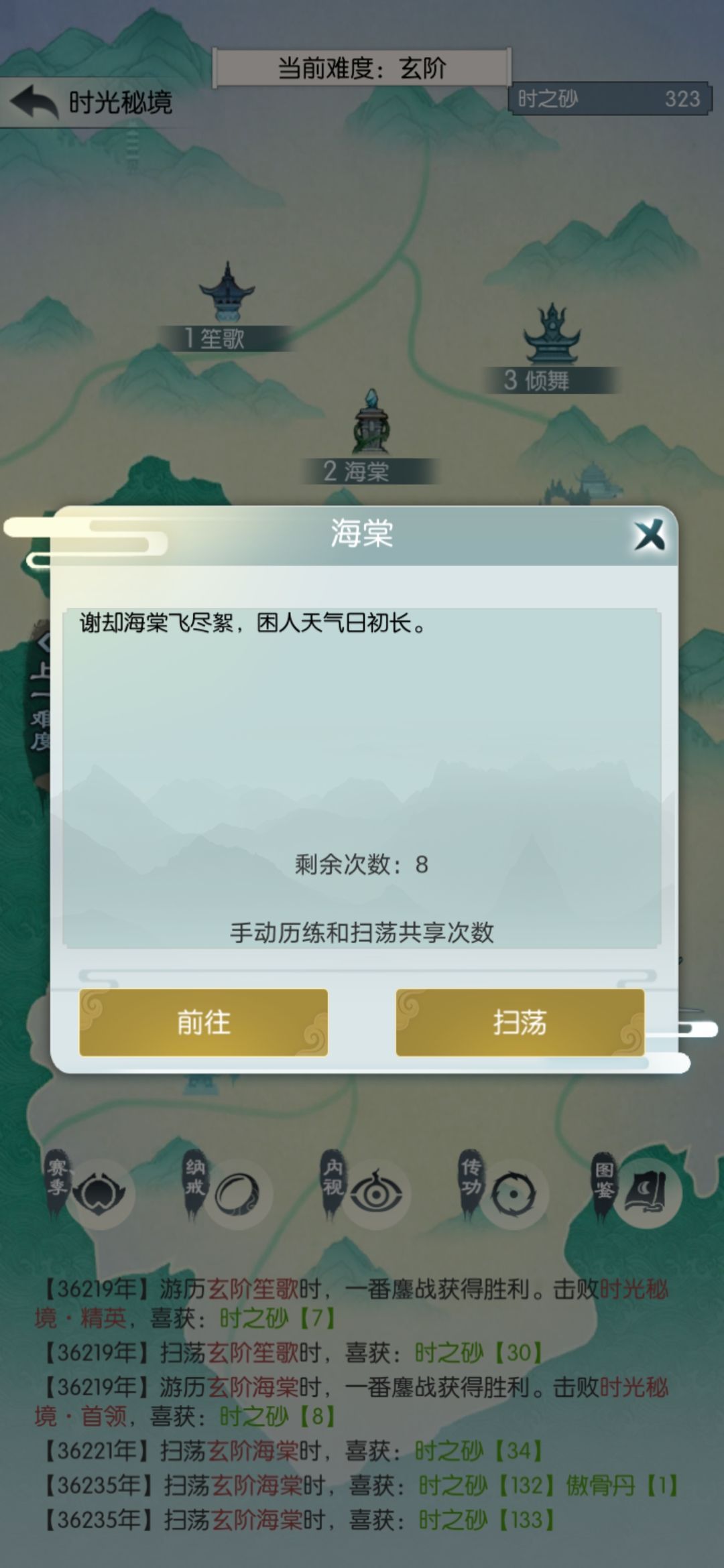 工资买属性相当于扫荡四次,有惊无险地通过玄笙歌和玄海棠,我感觉扫荡一次获得的属性赶不上怪物属性的增长。这里得开始打一关扫二,扫荡两次玄海棠再去玄倾舞。