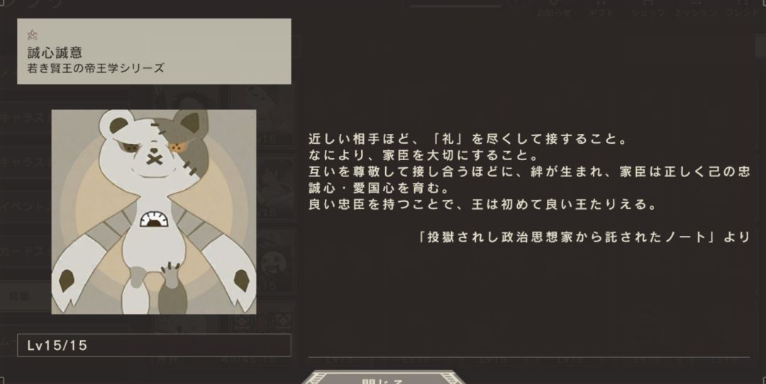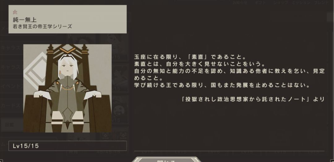 越是接近你的人,越要尽可能地礼貌对待。最重要的是珍惜家臣。越是互相尊敬和交往,越能产生羁绊,家臣就越能正确地培养自己的忠诚心和爱国心。因为有好的忠臣,所以王才能成为好的王。