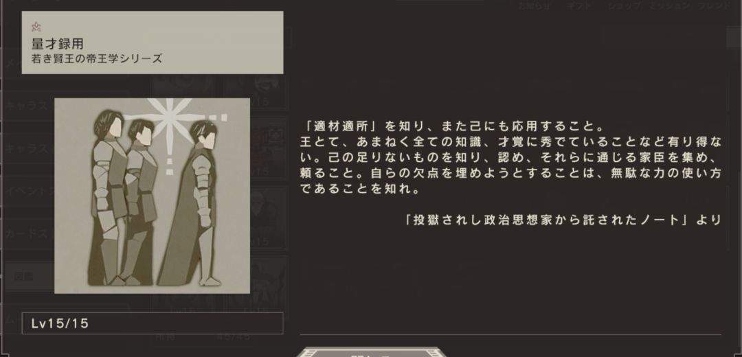 了解“适材适所”,并将其应用于自己。作为一个国王,不可能所有方面的知识和才智都很优秀。知道自己不足的东西,并且承认,收集与之相通的家臣,依靠他们。知道填补自己的缺点才是力量的真正使用方法。