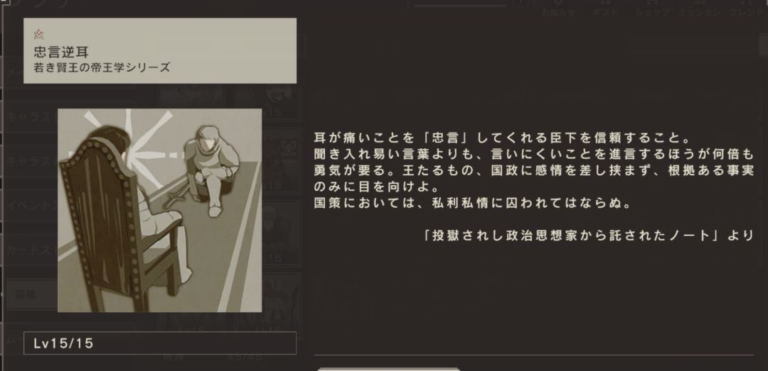 信任“忠言逆耳”的臣下。比起容易听懂的话,向别人进言更需要勇气。作为国王,不能随意干涉国政,而需要关注有根据的事实。在国策中,不能被私利私情所束缚。