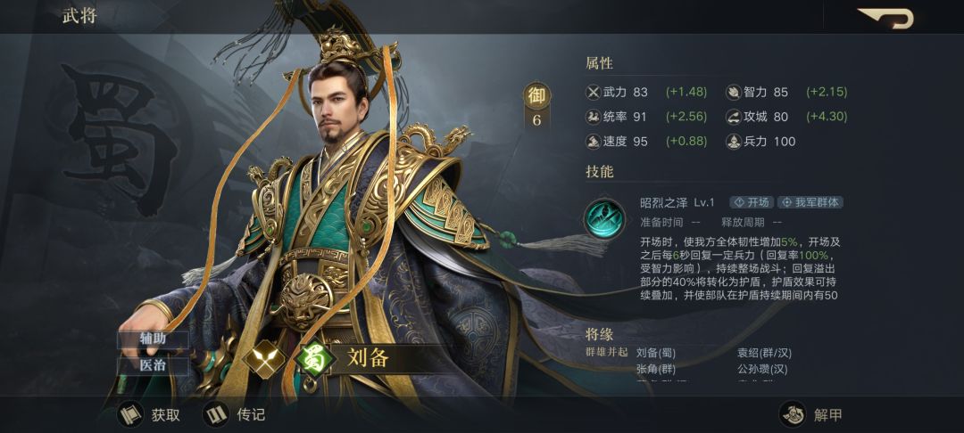 作为荣耀新三国最令人垂涎的武将之一,刘备的开场技能昭烈之泽可以使我方全体武将韧性增加5%,开场及之后每6秒回复一定兵力(回复率100%受智力影响),持续整场战斗;回复溢出部分的40%将转化为护盾,护盾效果可持续叠加,并使部队在护盾持续期间内有50%概率免疫控制,集韧性,回复,护盾和免疫控制于一身,可谓非常全面了。刘备加点推荐全智力,宝物推荐青囊书(战斗中,造成的兵力回复效果增加25%;每隔7.5秒,有75%几率佳兵力最低的我方部队回复一定兵力,回复率200%,受智力影响),屯田令(开场第24秒时,使我方兵力比最低的2支部队立即回复12%最大兵力,且之后每隔1.5秒回复一定兵力,回复率60%,受智力影响,持续15秒),镇军印(开场时,使随机3支我方部队获得伤害减免10% ,受智力影响,持续21秒),刘备带青囊书和屯田令是为了回血最大化,而带镇军印是为了降低四骑的输出伤害。