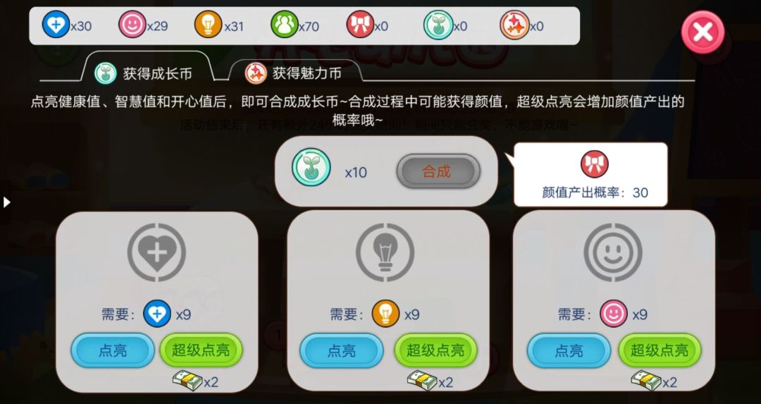 通过点亮健康、智慧、快乐三种属性来合成成长币,合成过程中有30%的几率获得颜值币,点击上方【获得魅力币】切换界面,就可以去合成魅力币啦~