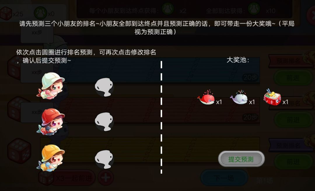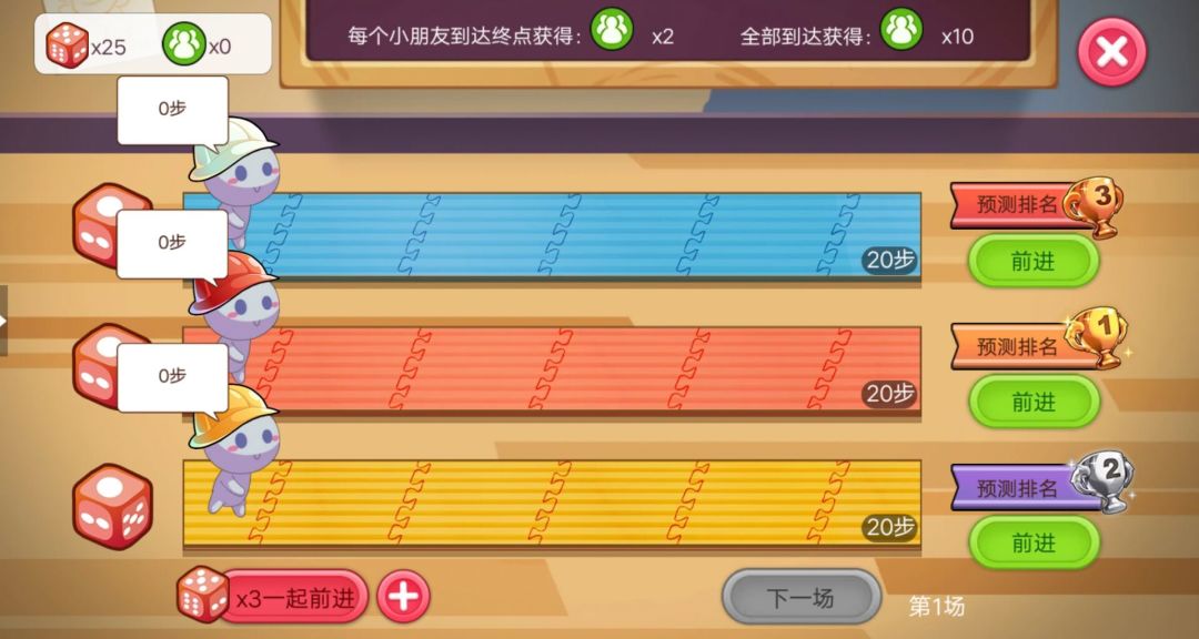 预测后开始游戏,点击左下角的【一起前进】投掷骰子让小朋友向前走,每位小朋友到达终点都可收获社交属性值;同时,如果想让某位小朋友更快前进,也可以选择右侧的【前进】帮他多走~