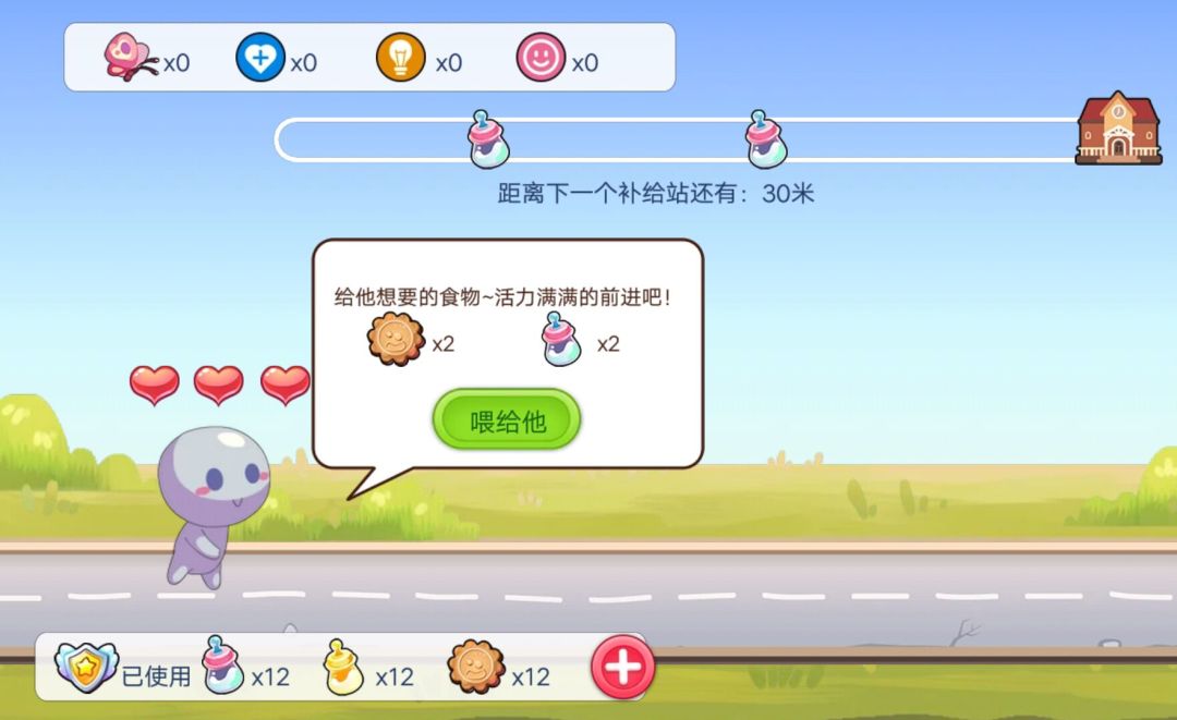 每次使用一个体力开始游戏,开局会选择携带一定数量的小饼干和两种口味的宝宝奶。