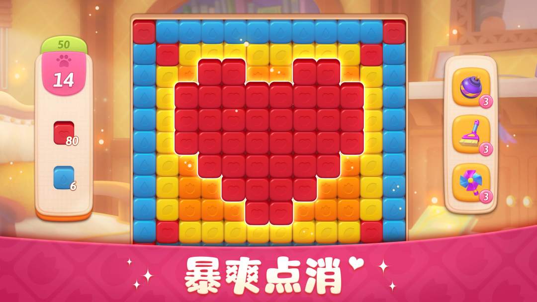 全新点击&爆破&消除玩法上线,大量精心设计的消除关卡,创意满满!猫咪、多肉盆栽、冰激凌、毛线球等数十种特色元素,障碍元素与装修息息相关,更具有家的温馨感~心形关卡、四叶草关卡等近百种关卡形状,更有横竖消、爆炸球、五色消等强力道具加成,丰富设计,惊喜不停!