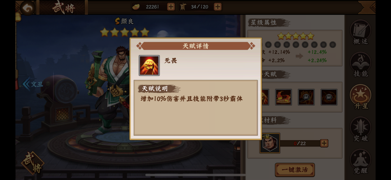 而武将升至4星之后,能够激活拳伤天赋,该天赋可以减少2秒的技能CD,让其技能的冷却时间从8秒降至6秒,更短的技能CD意味着颜良能够比别人更快的使用吸附技能抓人,极大的提高了PK的主动性。