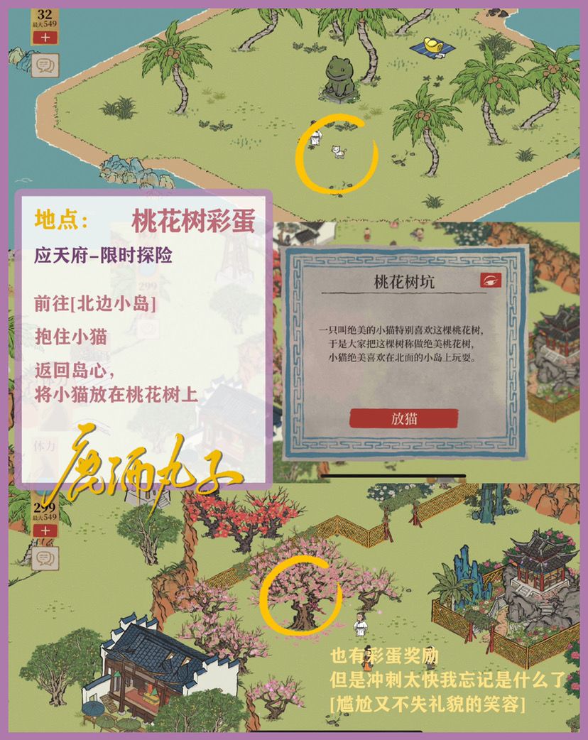 前往[北方小岛]抱起小猫,将小猫放在[岛心]的桃花树上即可获得彩蛋奖励