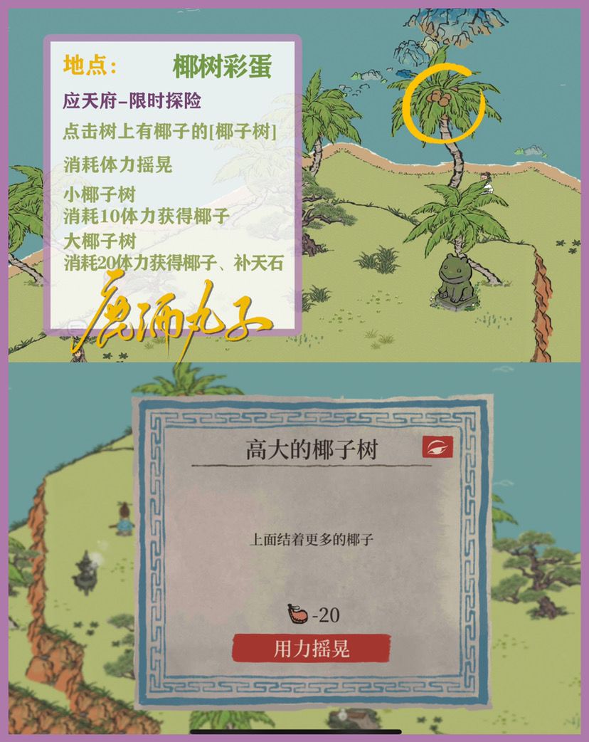点击树上有椰子的[椰子树],消耗体力摇晃获得[椰子、补天石]
