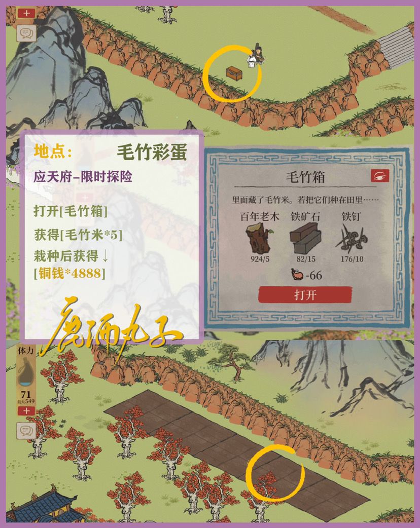 打开毛竹箱获得毛竹米,在空地上种植全部毛竹米即可获得[铜钱*4888]