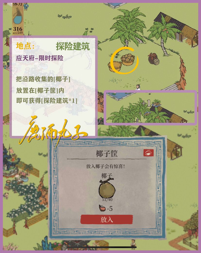 ⭐️探险沿路的地上、水里、树上都有椰子,采集之后放进[椰子筐]内,即可获得本次限时探险建筑,椰子不够可以参考[图12]的椰子获取方法获得更多的椰子